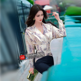 气质撞色长袖 欧货品牌休闲套装 衬衫 新款 女 垂感喇叭裤 早秋法式