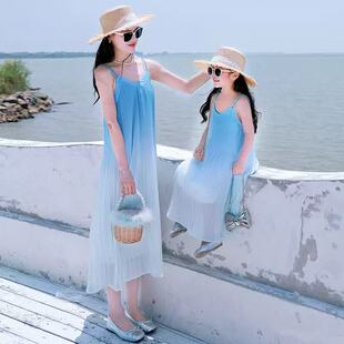 夏天海边度假一家三口母子T恤吊带裙 渐变母女2025新款 法式 亲子装