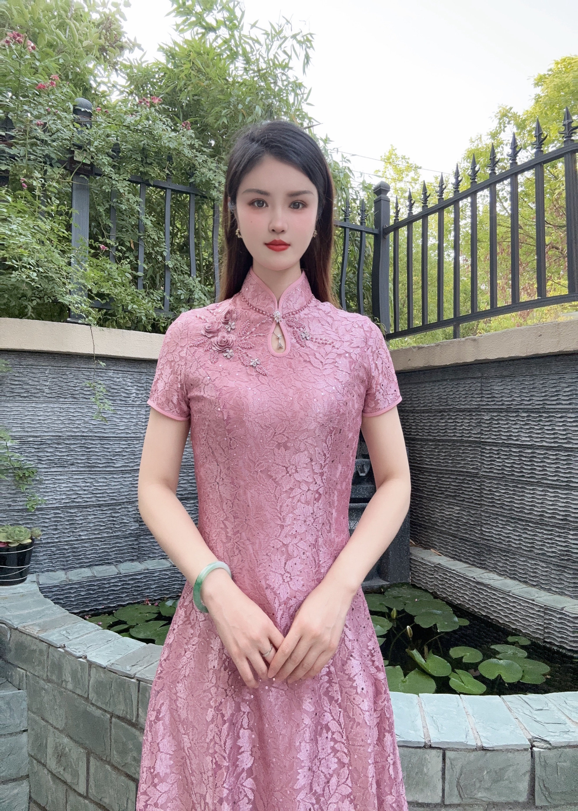 蕾丝旗袍敬酒礼服 秀丽华服6806短袖 年轻妈妈装 红色礼服