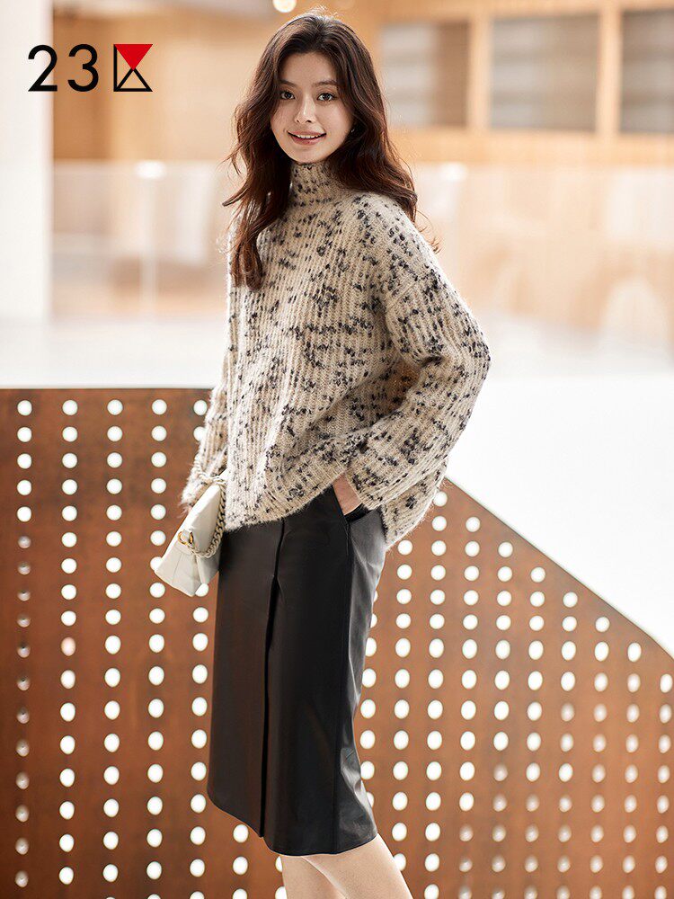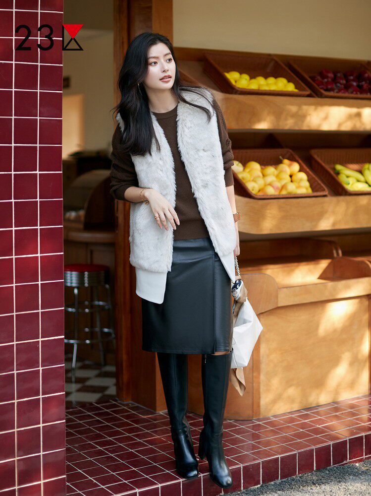 23区日系秋季 通勤职业OL羊革前开叉直筒半身裙皮裙中裙商场同款