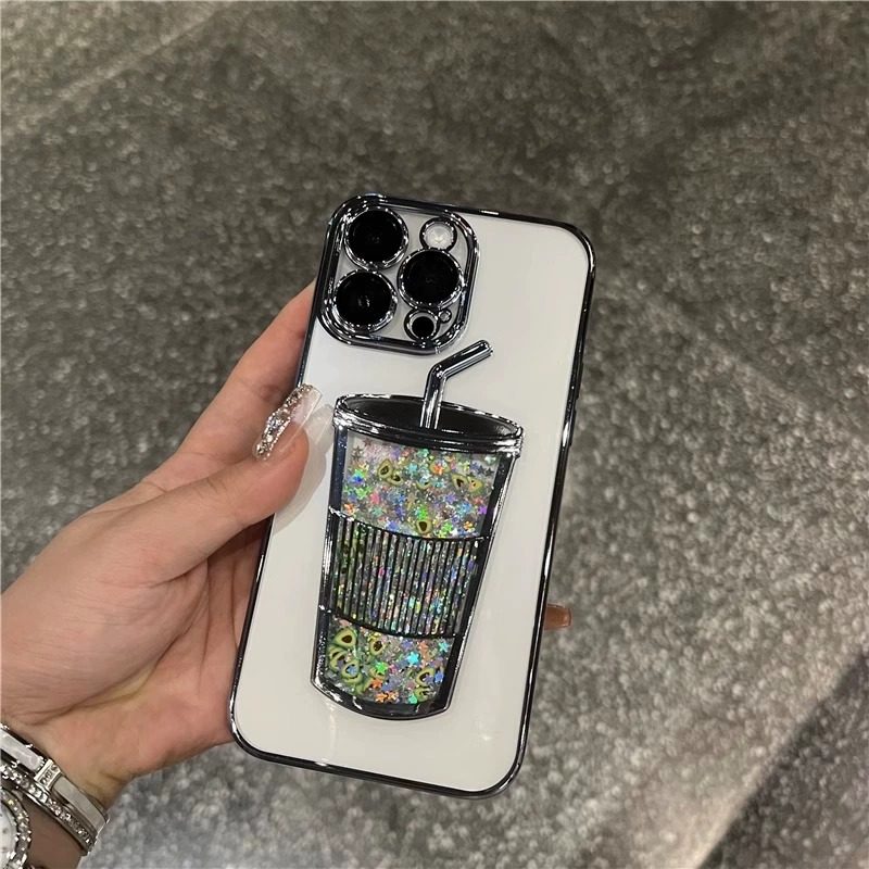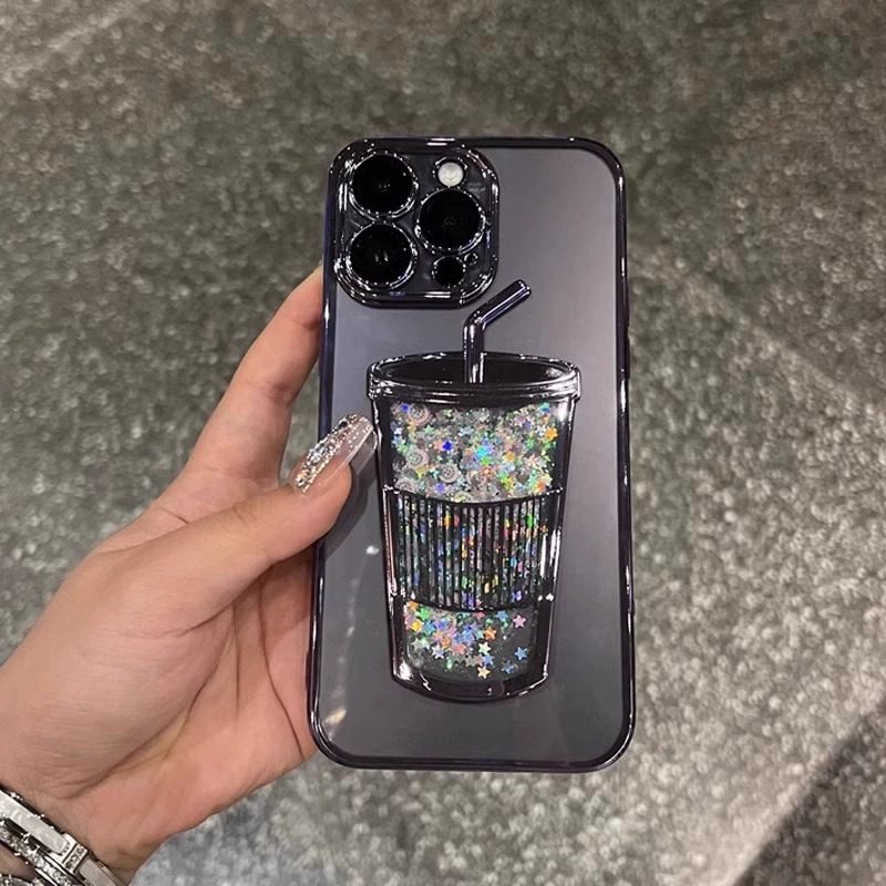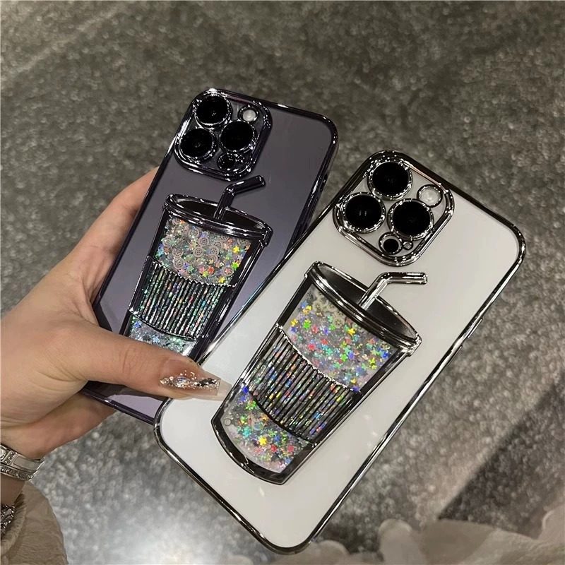流沙奶茶杯子适用苹果15promax手机壳女款 13带镜头膜高级感12立体11保护套 全包夏日透明软壳iphone14pro新款