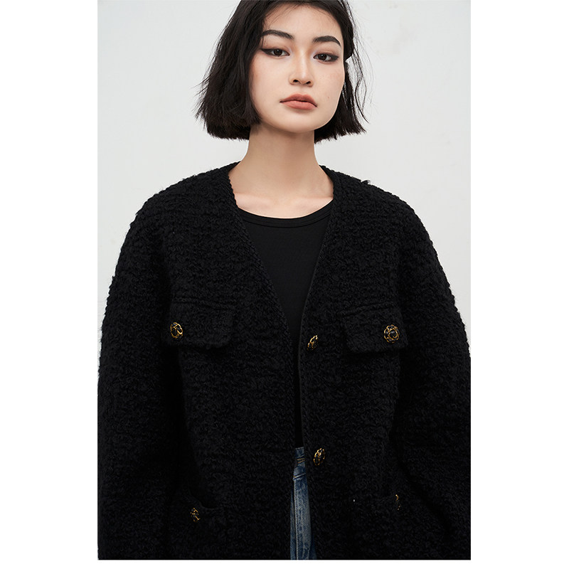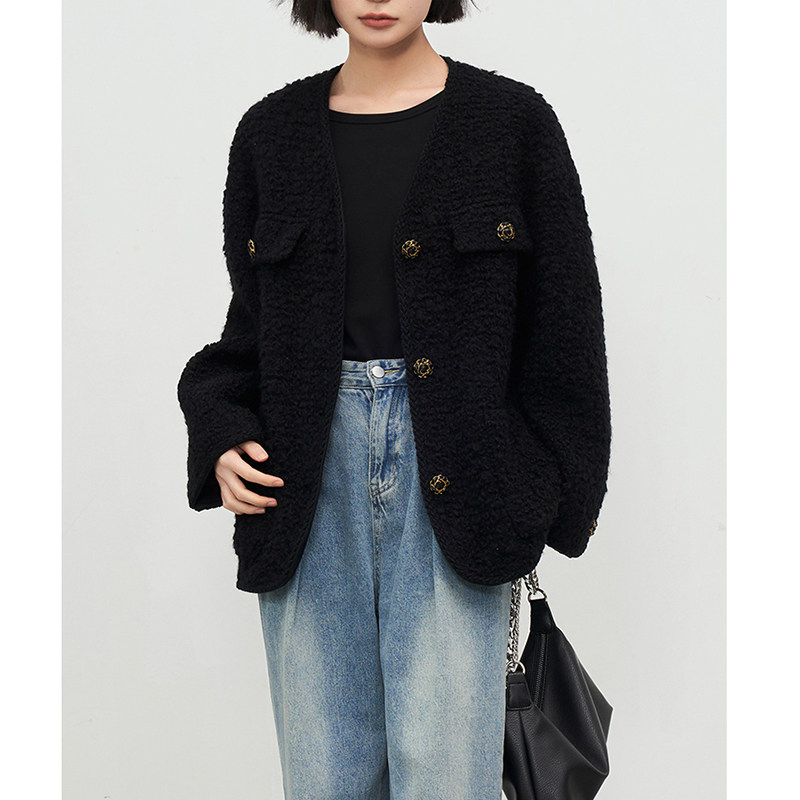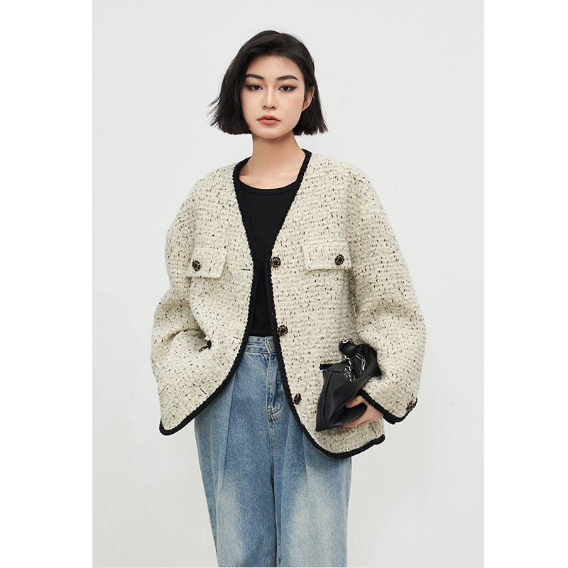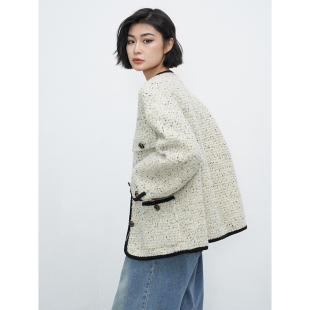 CHICVEN「回归主义」春小香毛呢外套女重工长袖 复古V领粗花呢上衣