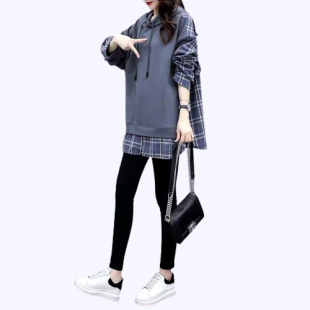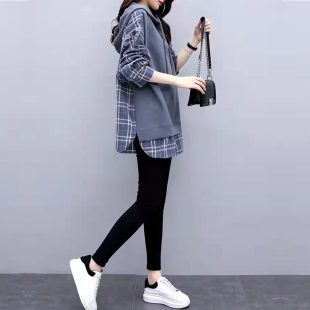 休闲显瘦卫衣女宽松遮肚连帽假两件上衣潮 2023新款 大码 胖mm春秋装