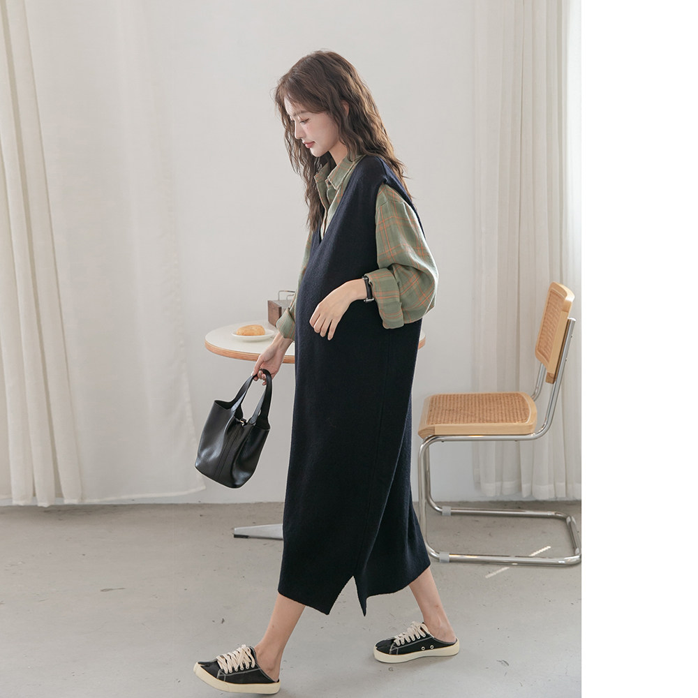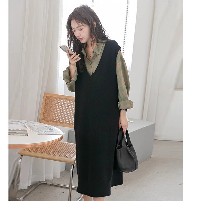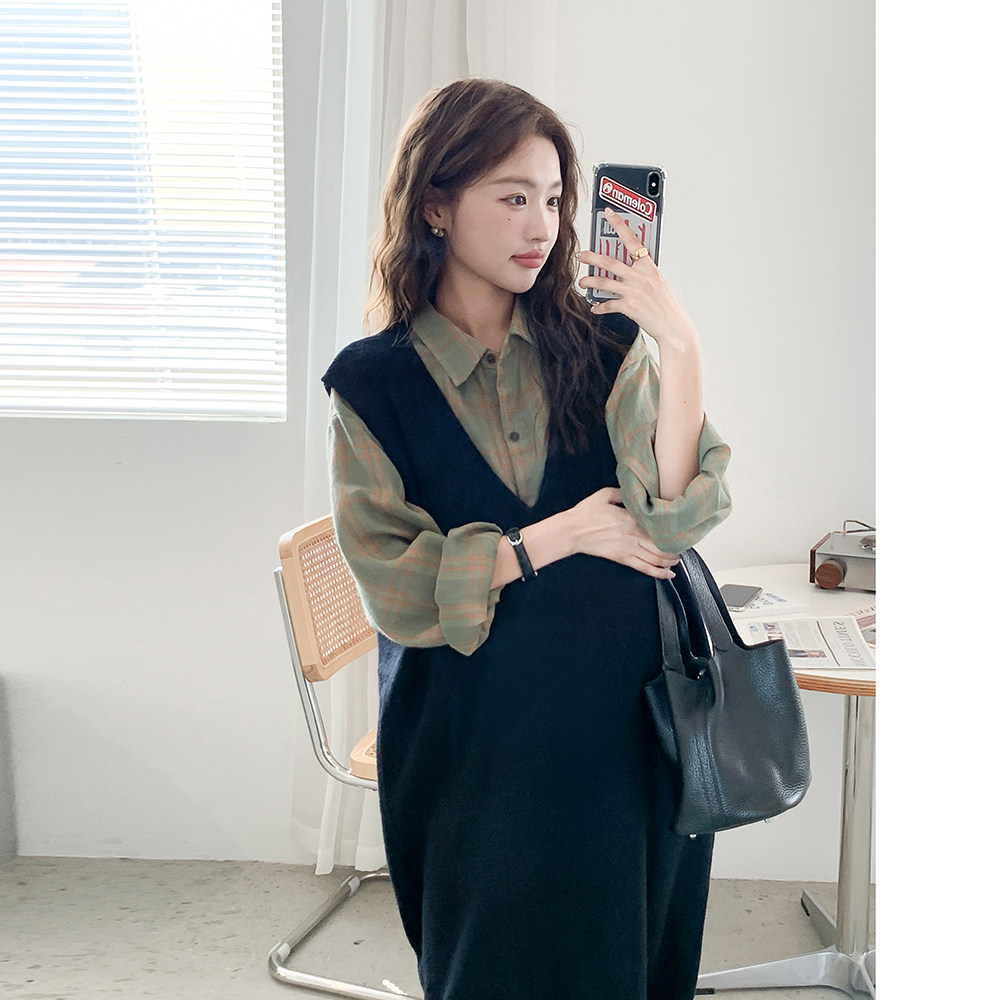 春装 背心裙格子衬衫 套装 针织衫 上衣两件套春秋孕妇裙子 时尚 孕妇装