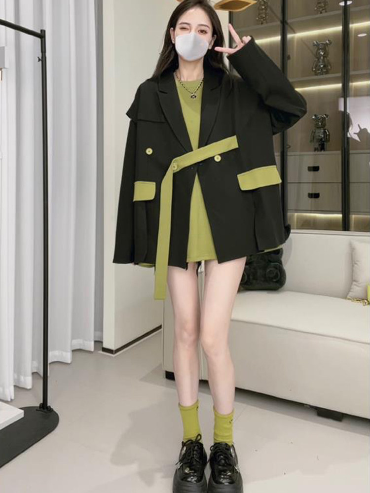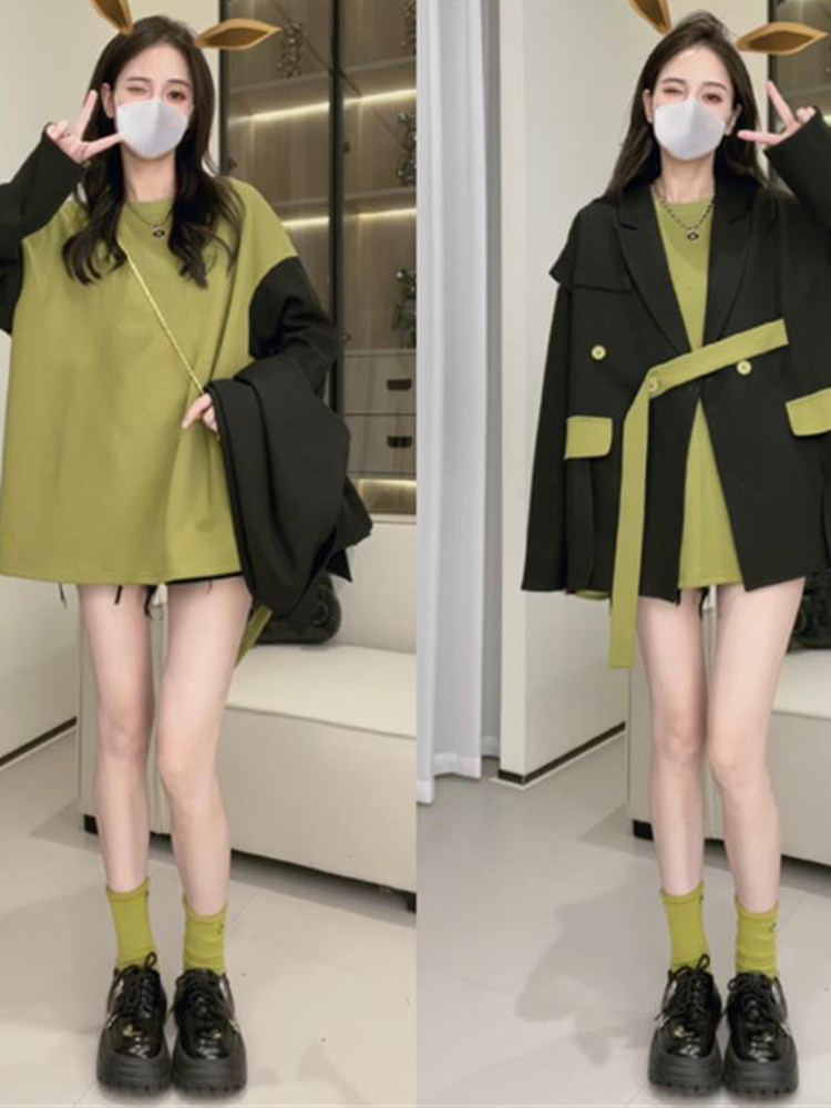 设计感外套 加套头卫衣两件套秋今年流行新款 大码 胖妹妹撞色小西装