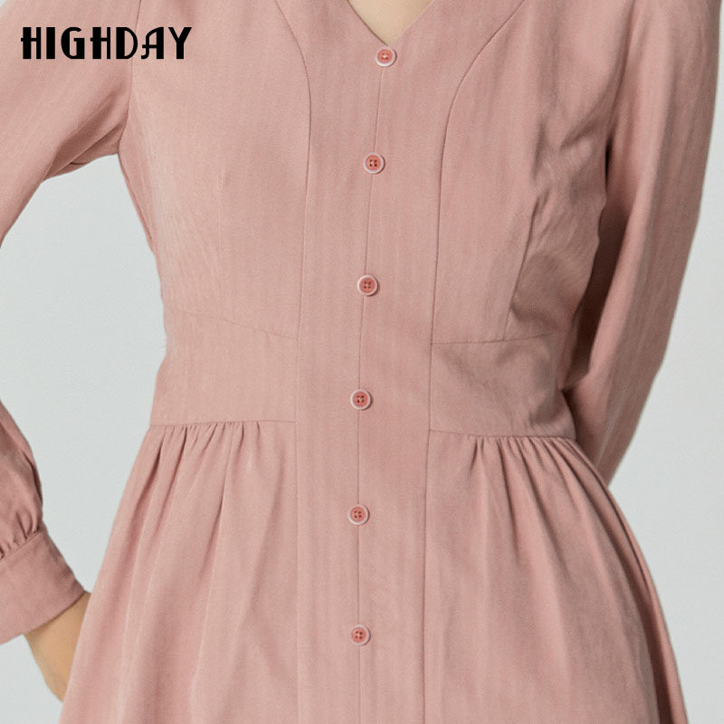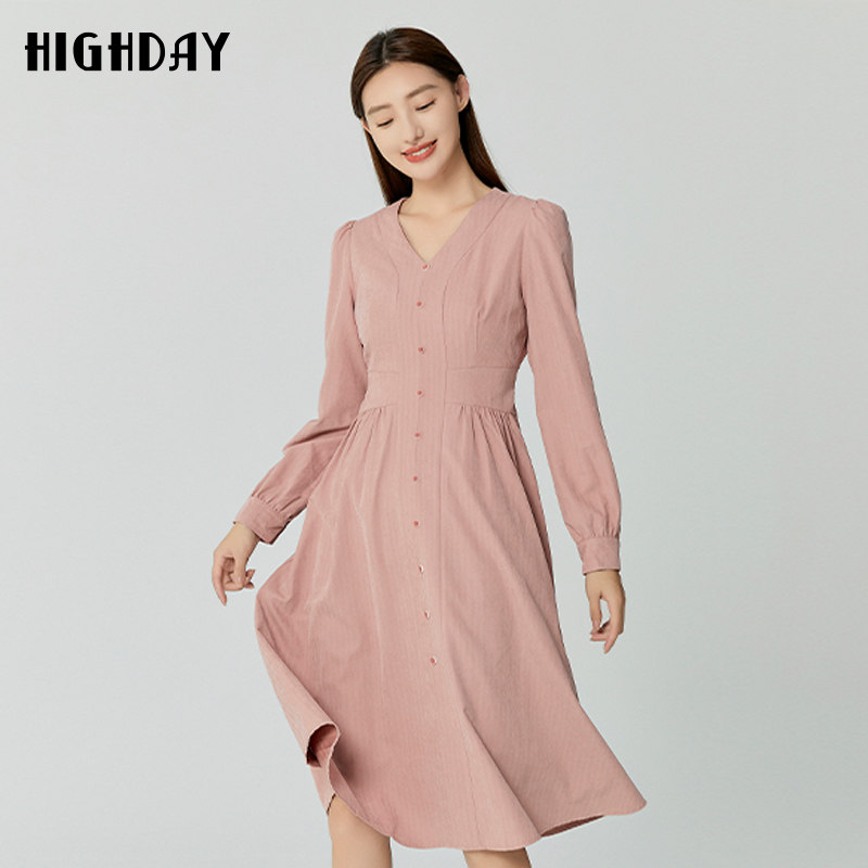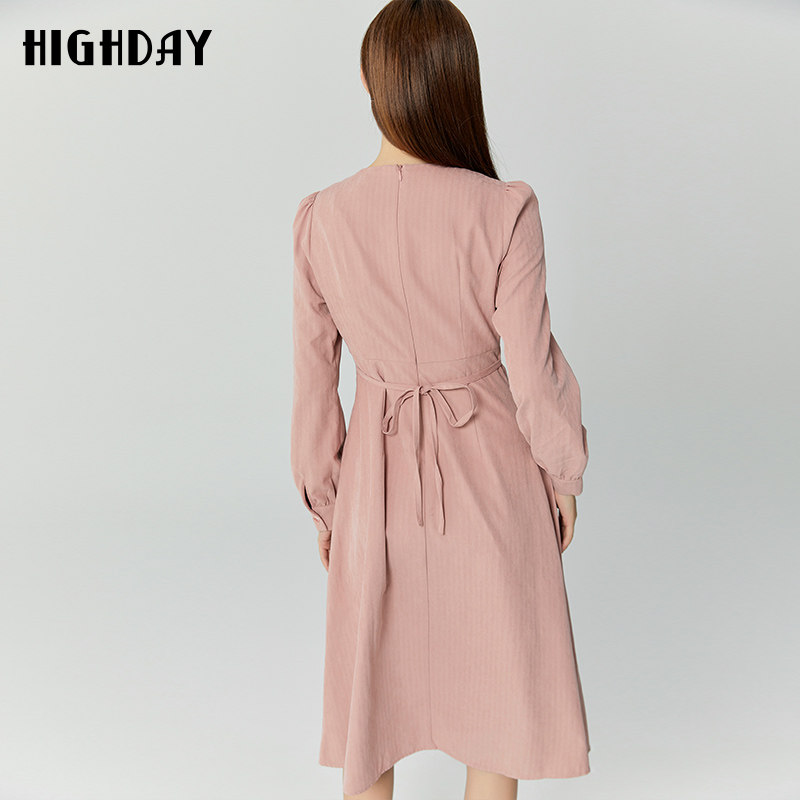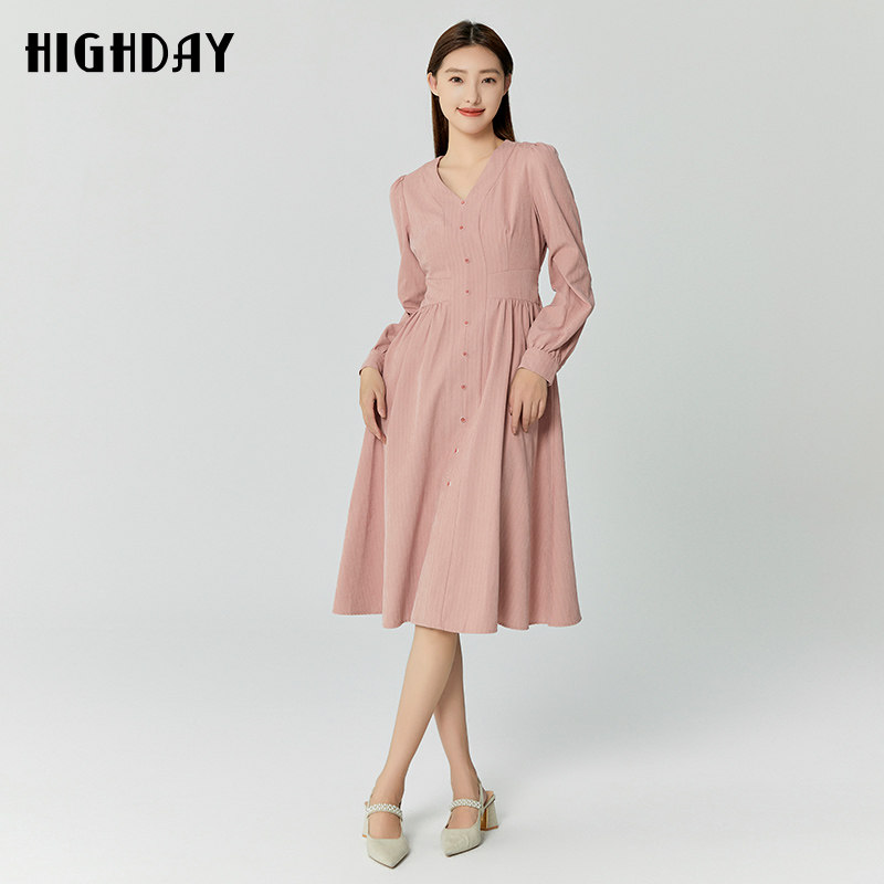新款 女裙2026春季 温柔风连衣裙 V领藕粉色修身 highday轩日商场同款