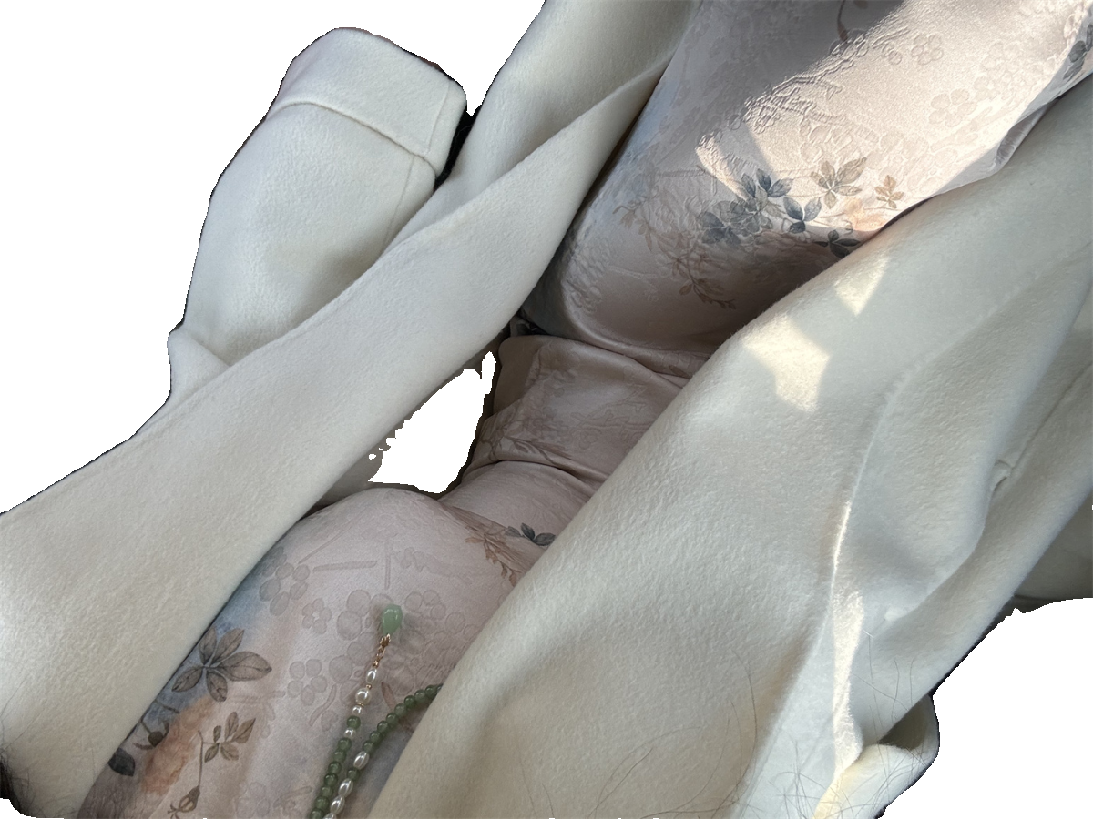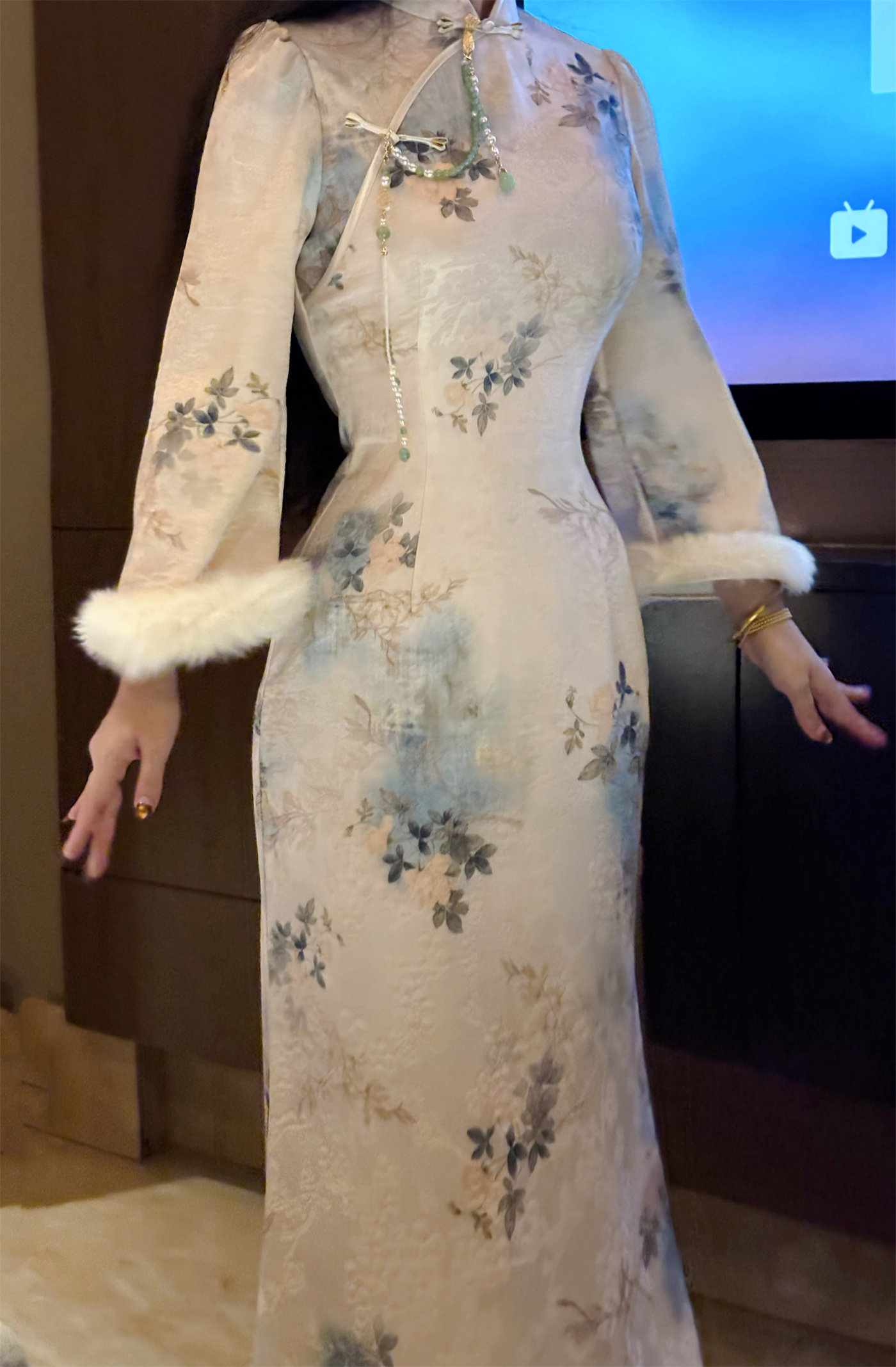 玉白盈粉美利奴羊毛水貂旗袍针织连衣裙 新中式 澄渔高定 洛神赋