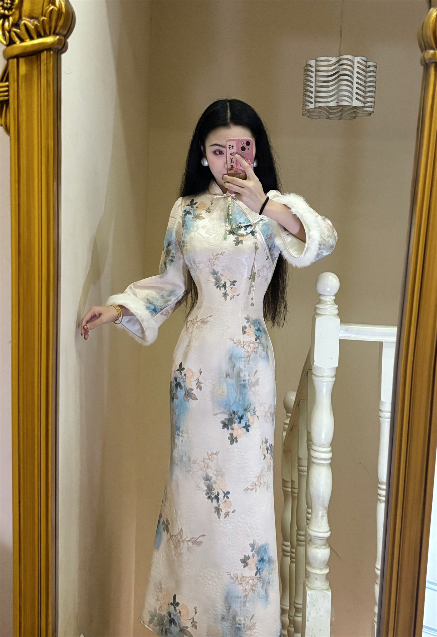 狐狸毛黑色丝绒旗袍长袖 国风高级定位刺绣厚款 金竹 dk新中式 Mimo