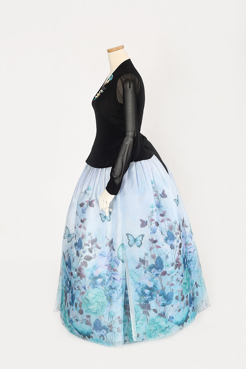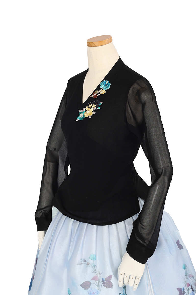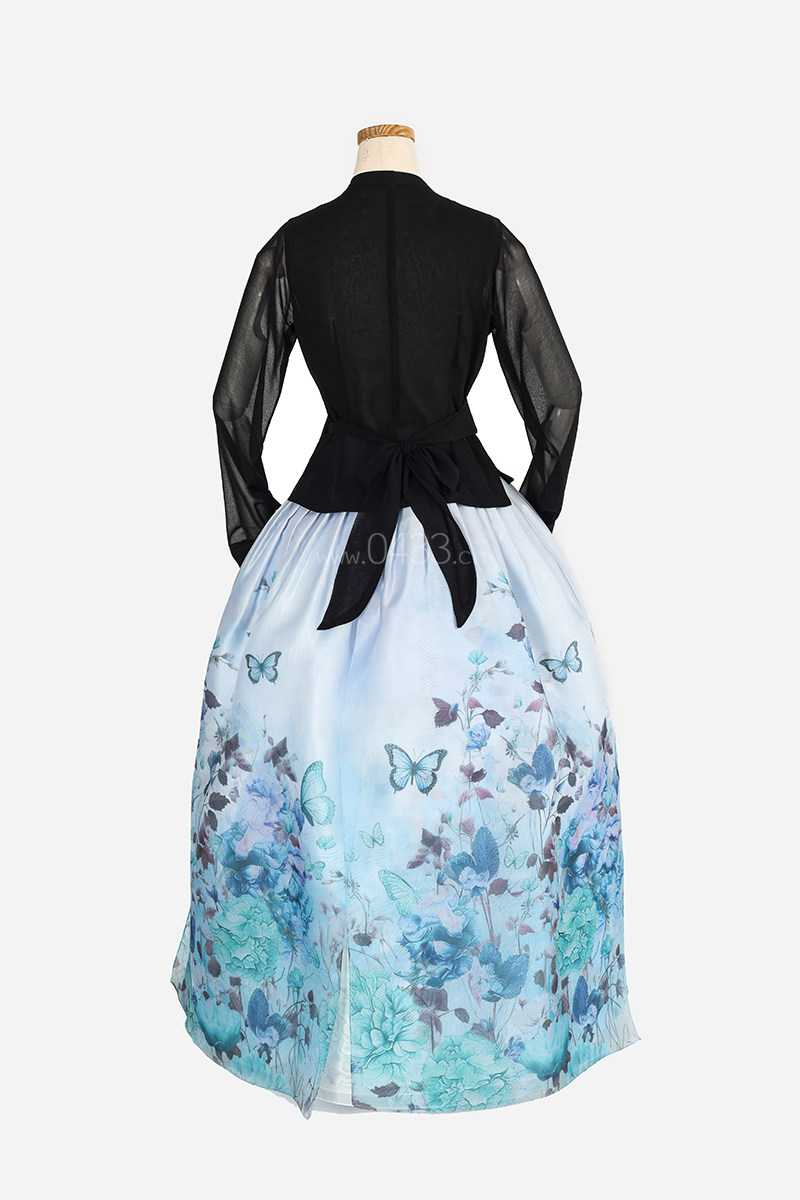朝鲜族舞蹈练习腰裙练功服仿真丝黑色上衣花王面料3层6开裙U23045