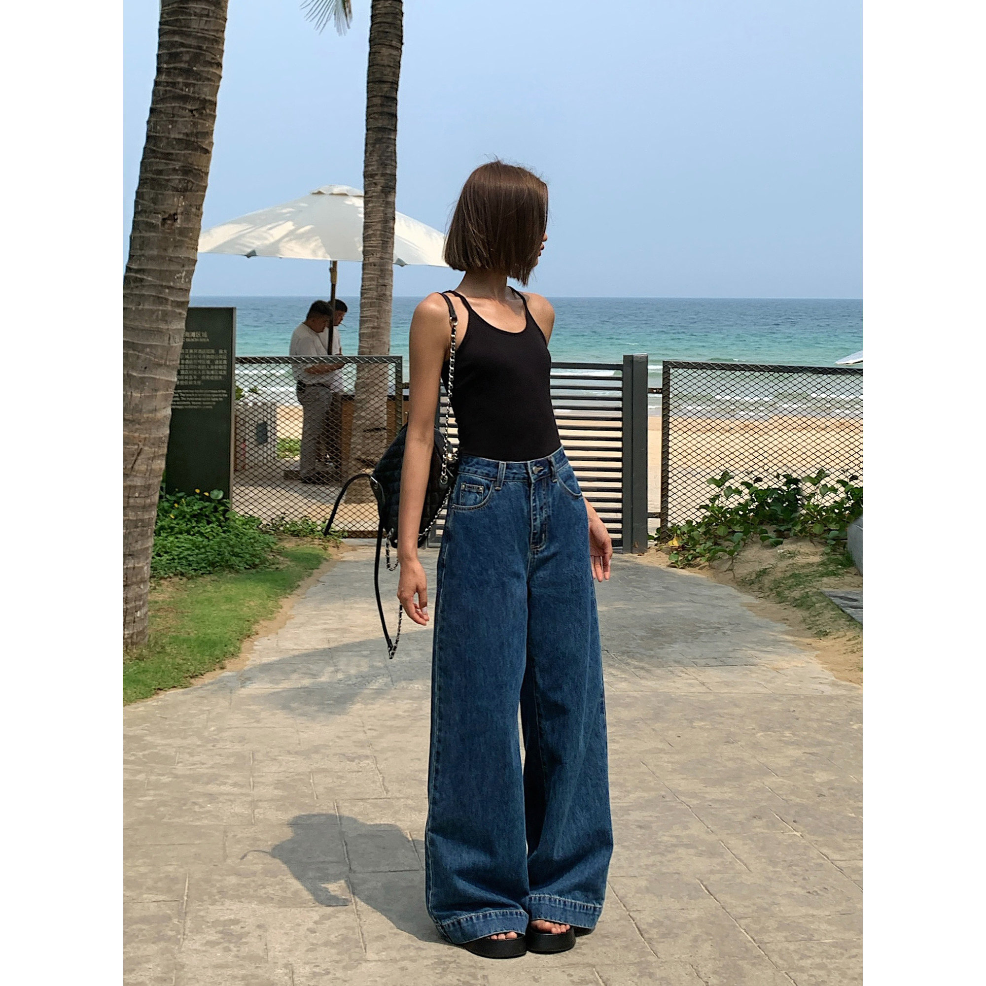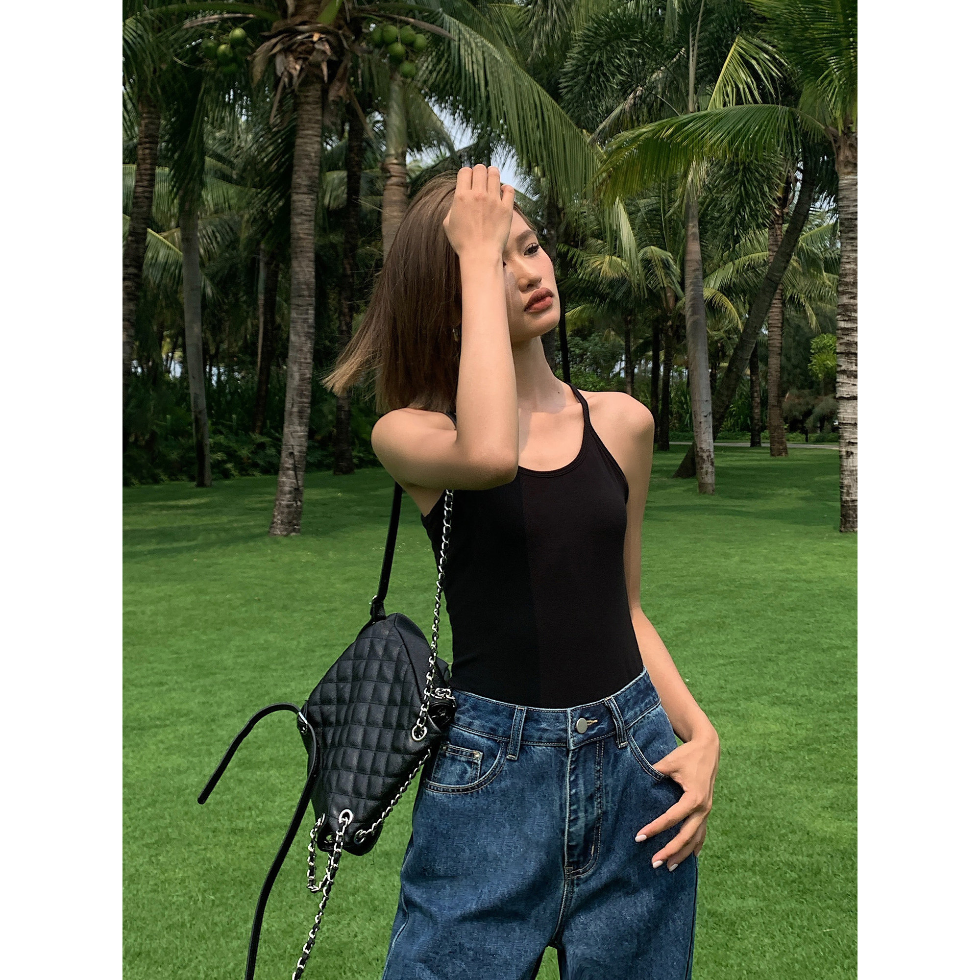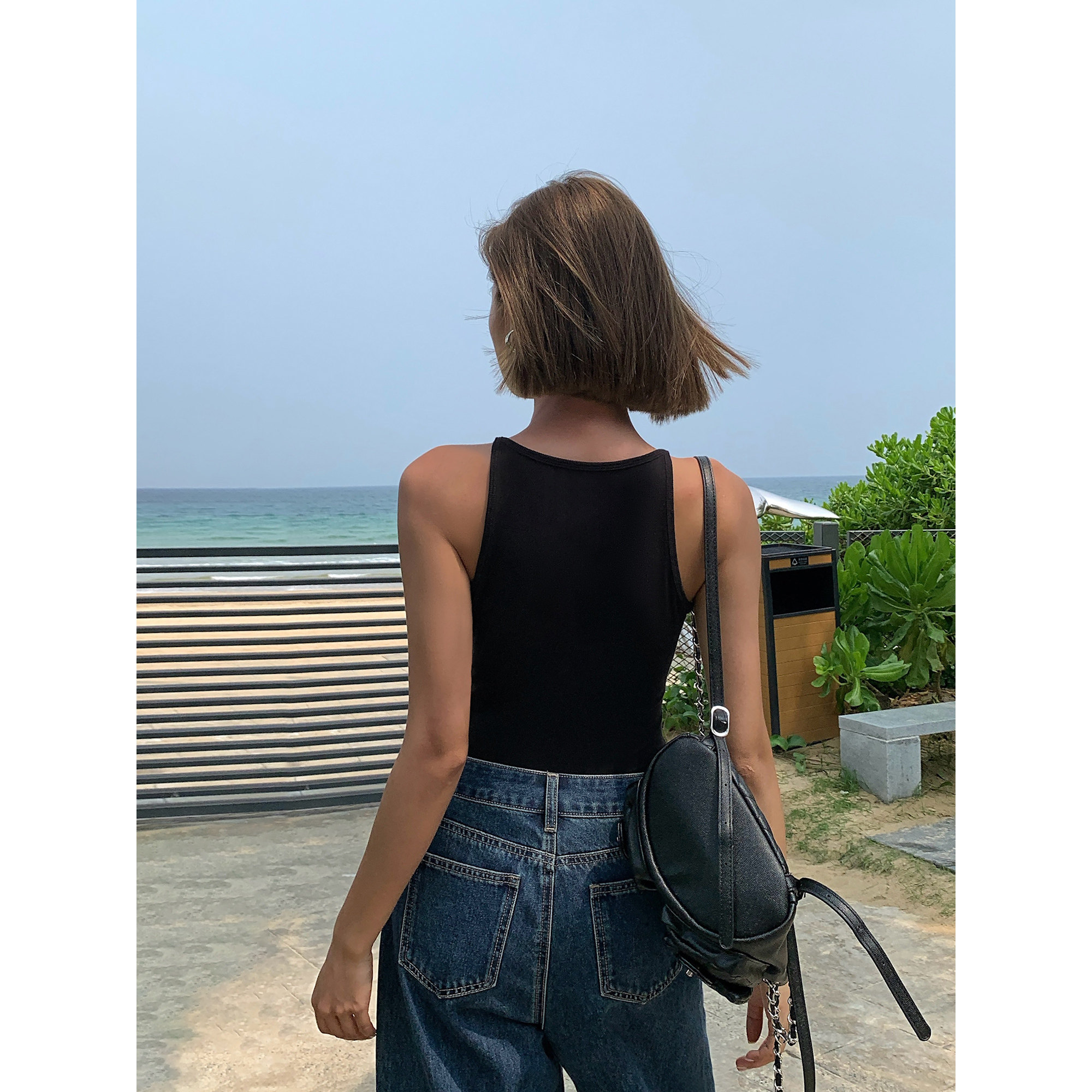 内搭吊带针织背心外穿女U领气质上衣 黑色无袖 ousph 现货6折