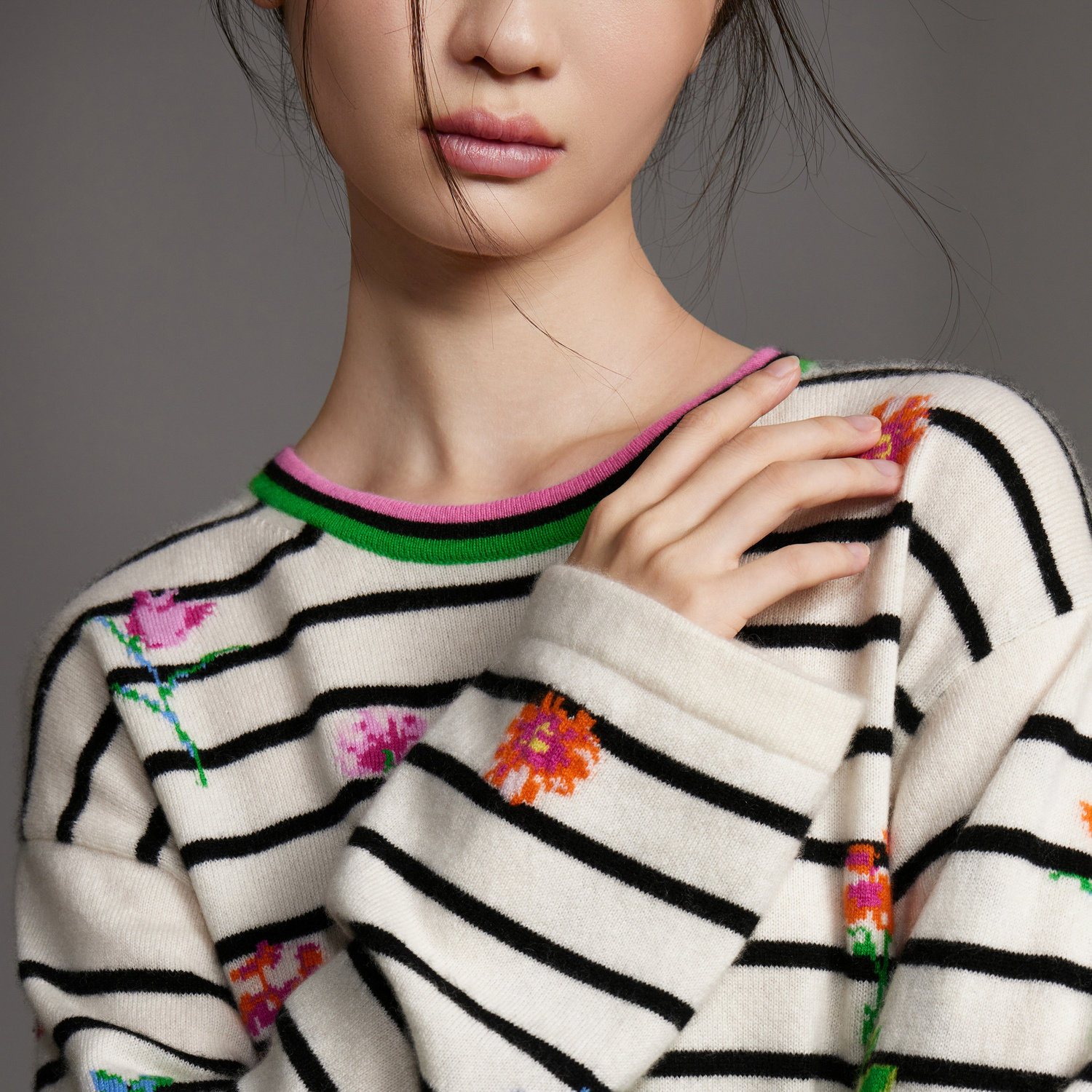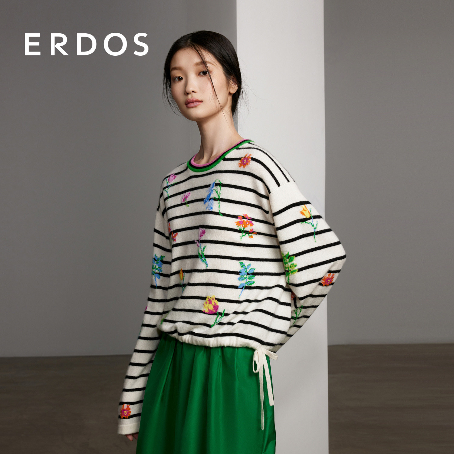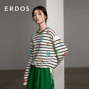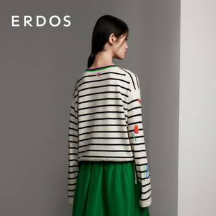 条纹宽松抽绳针织毛衣 女春季 ERDOS 圆领电脑提花纯羊绒衫
