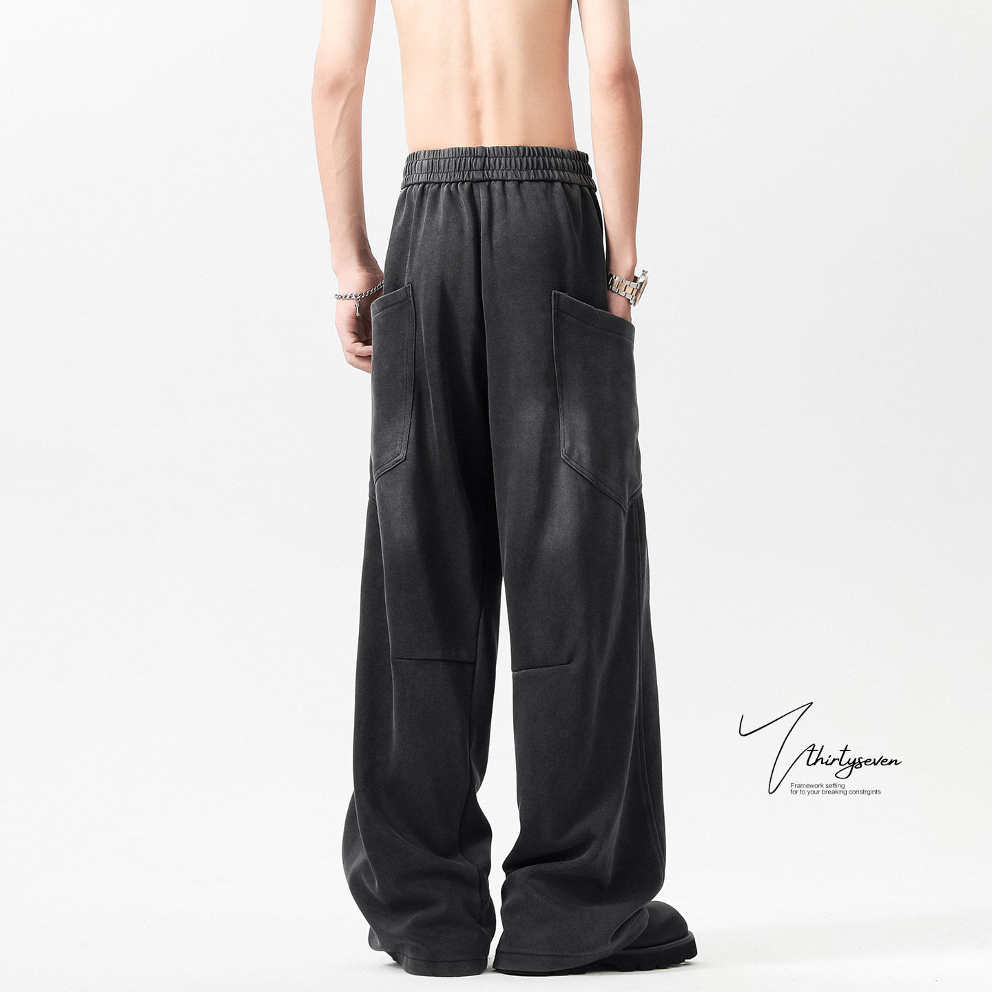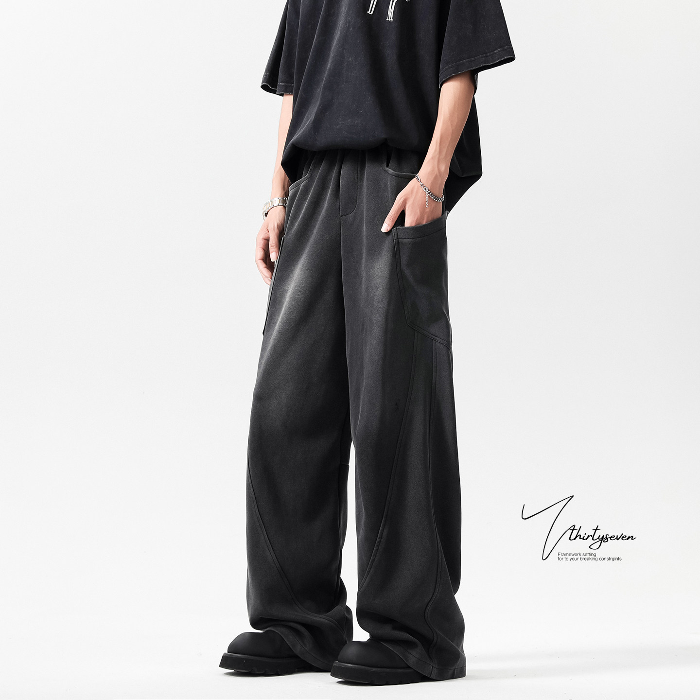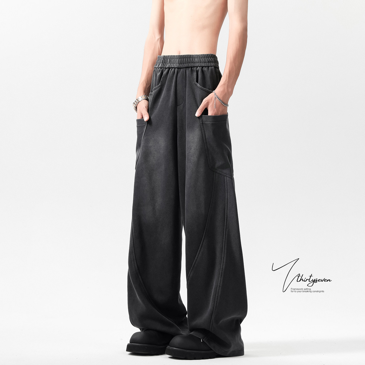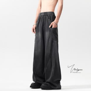 休闲裤 解构拼接斜切水洗做旧卫裤 复古垂感宽松拖地工装 新款 男春季