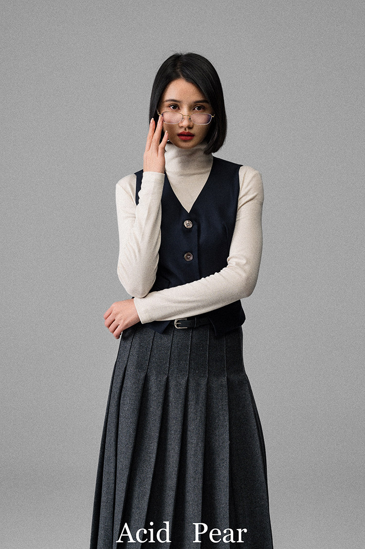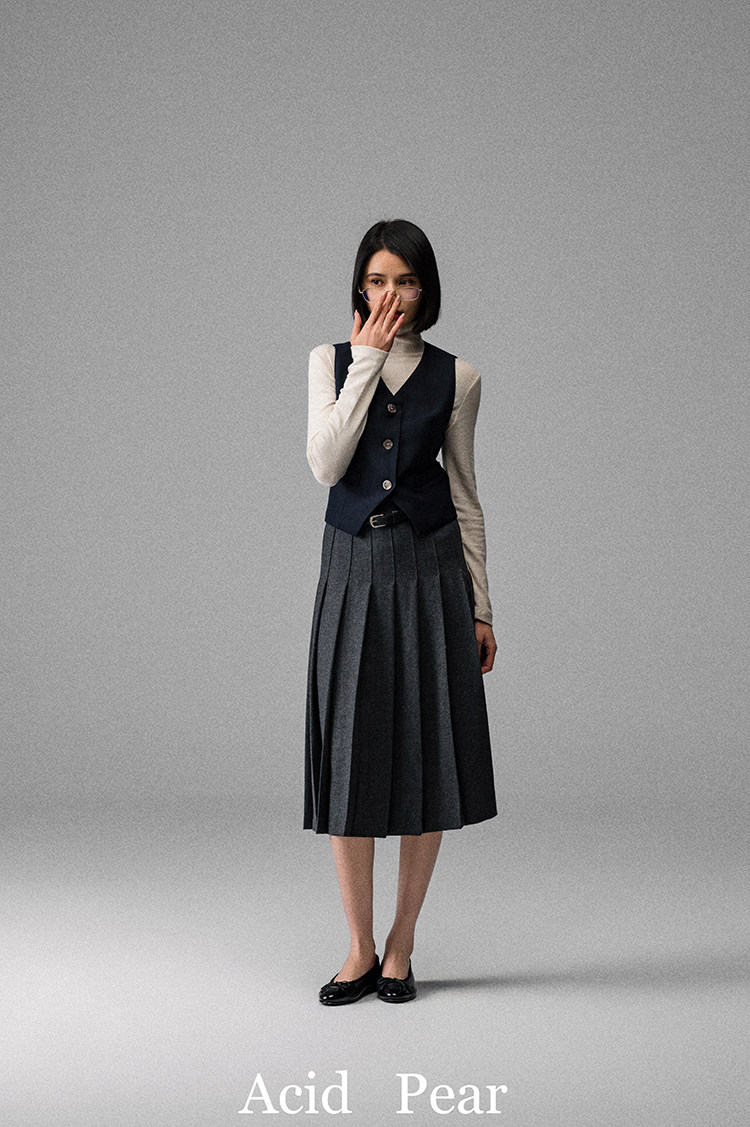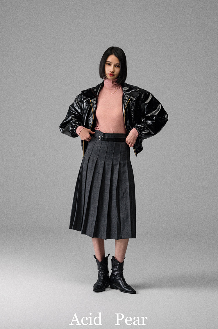 Acid 一族早春灰色羊毛显瘦百褶裙腰带半身裙A字裙女 Poire