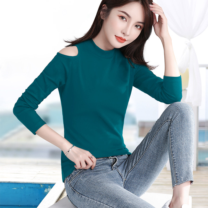 外穿2024年新款 孔雀蓝半高领长袖 漏肩膀春季 弹力打底衫 t恤女修身