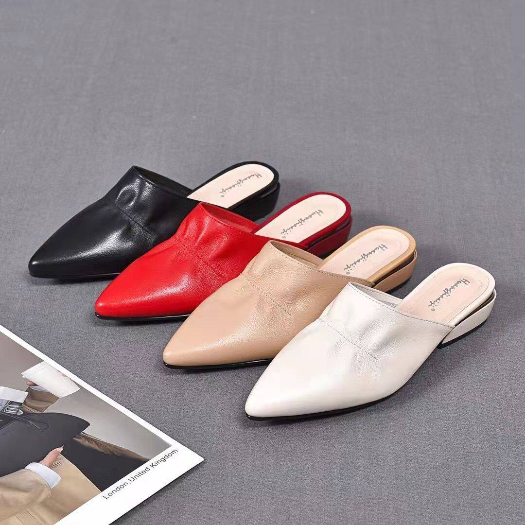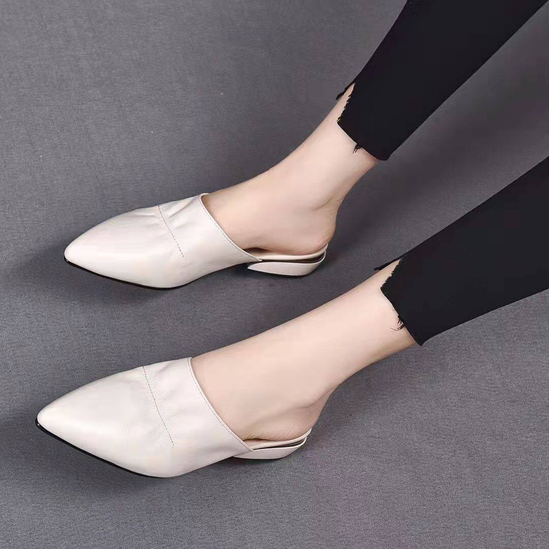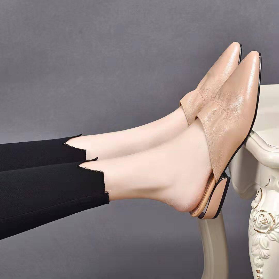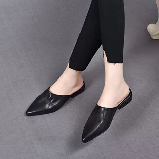 头层牛皮橡胶大底平跟尖头一脚蹬百搭女拖鞋 真皮女鞋 新款 2023春季