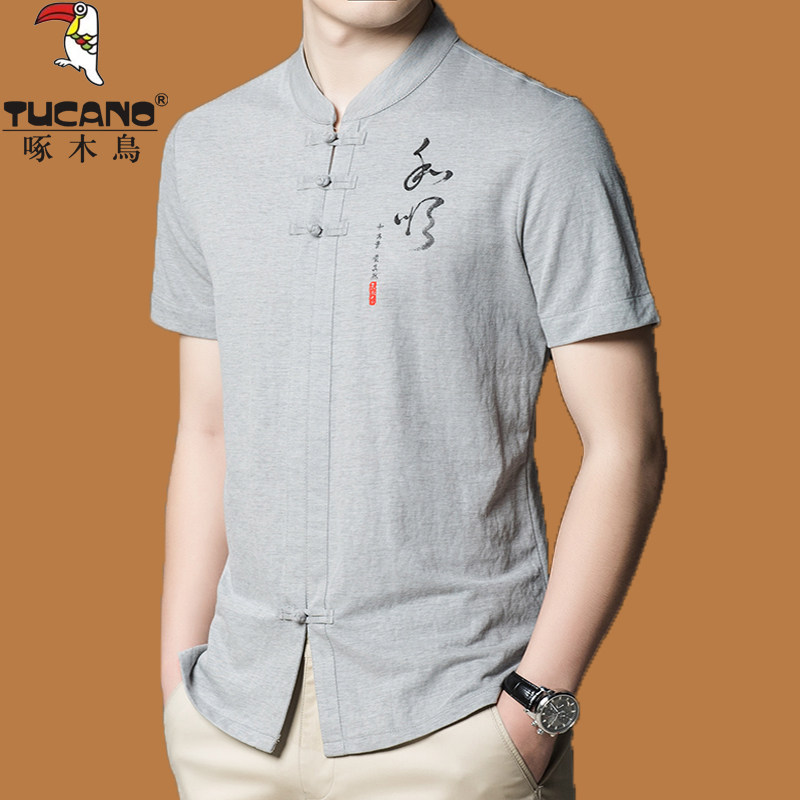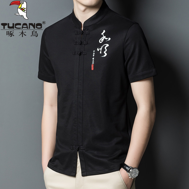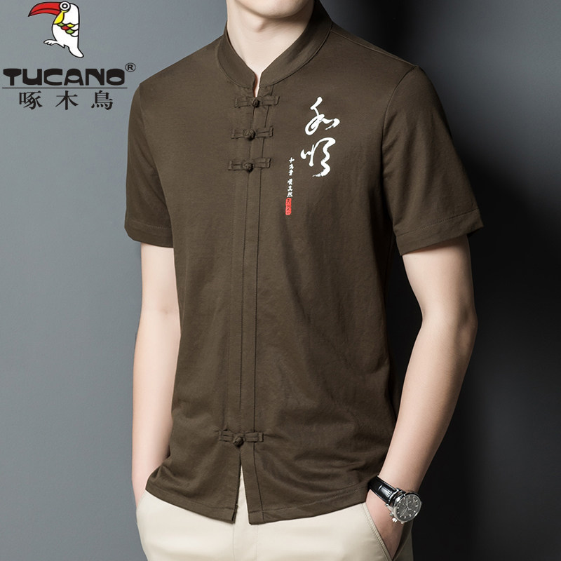 中国风t 爸爸唐装 啄木鸟高端冰丝立领t恤男短袖 中年宽松桑蚕丝半袖