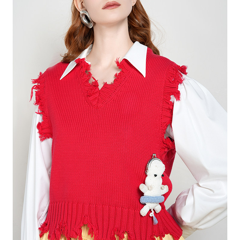 红色上衣女装 气质可拆毛领针织衫 513684 冬季 三福圆领毛衣2025新款