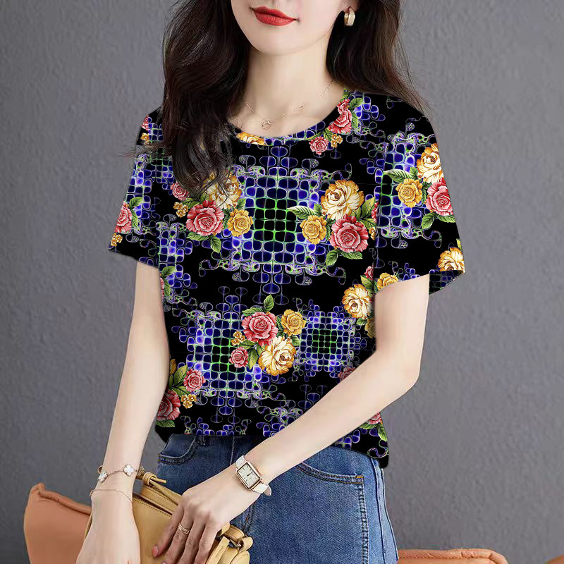 遮肚气质小衫 透气新款 百搭短袖 上衣女装 碎花 显瘦T恤印花薄款 夏季