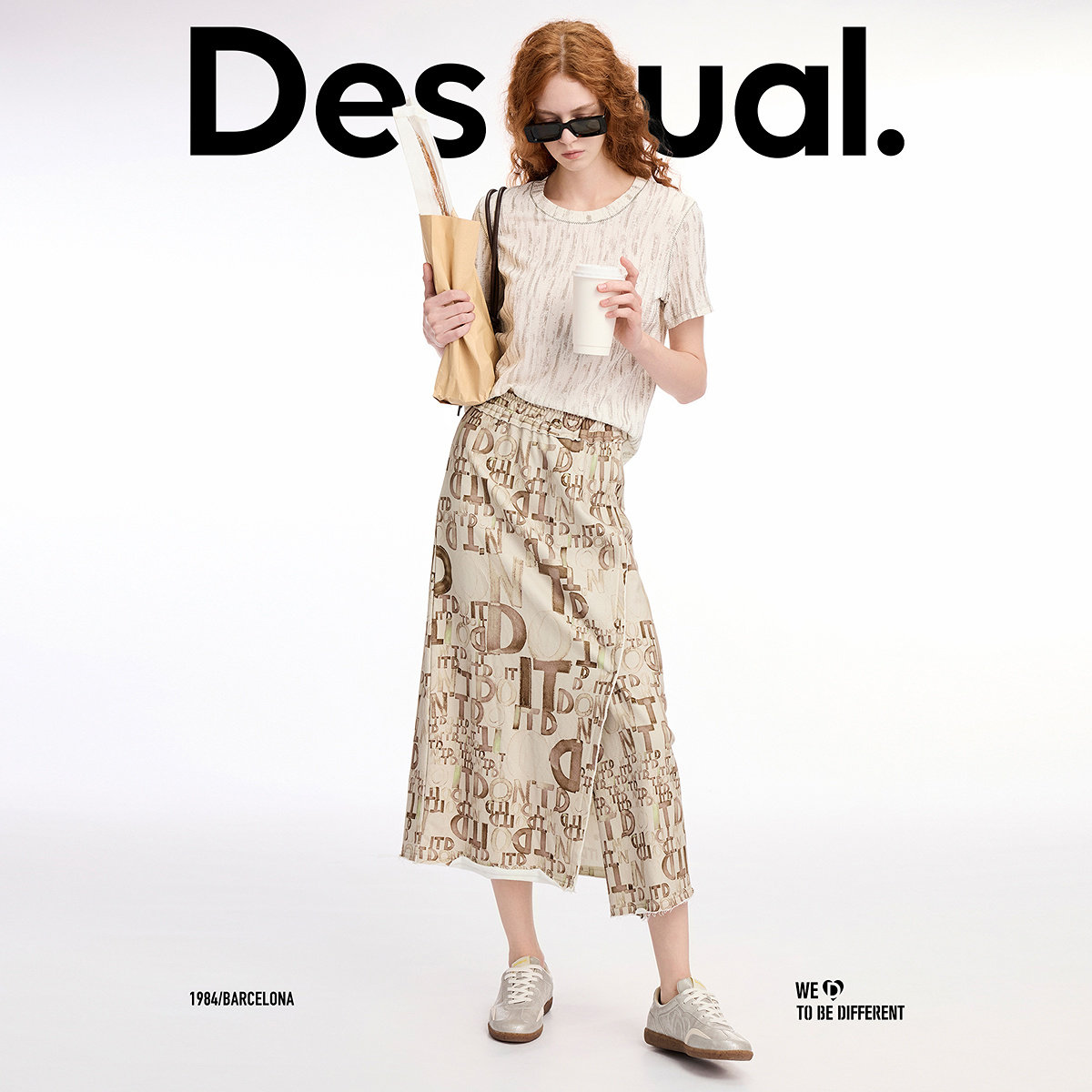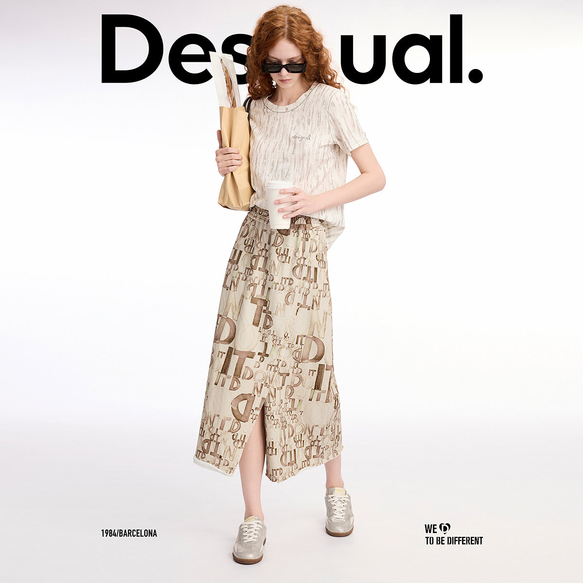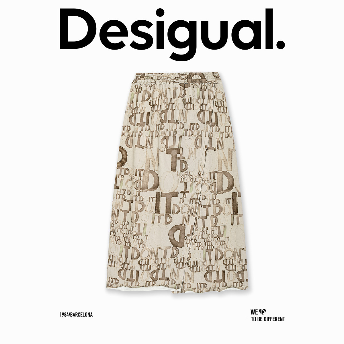 Desigual直筒字母印花松紧腰头前开叉长款 半身裙