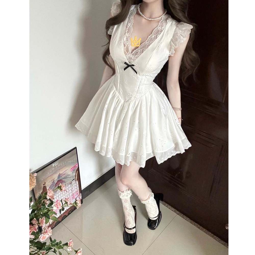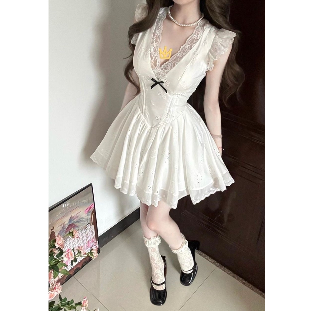 纯欲甜美芭蕾风V领连衣裙女夏季 A字短裙子 收腰显瘦网纱拼接小飞袖