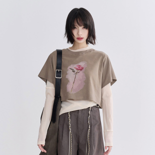 宽松短款 T恤女夏季 露腰上衣 油画玫瑰花正肩短袖 万有引力博物馆