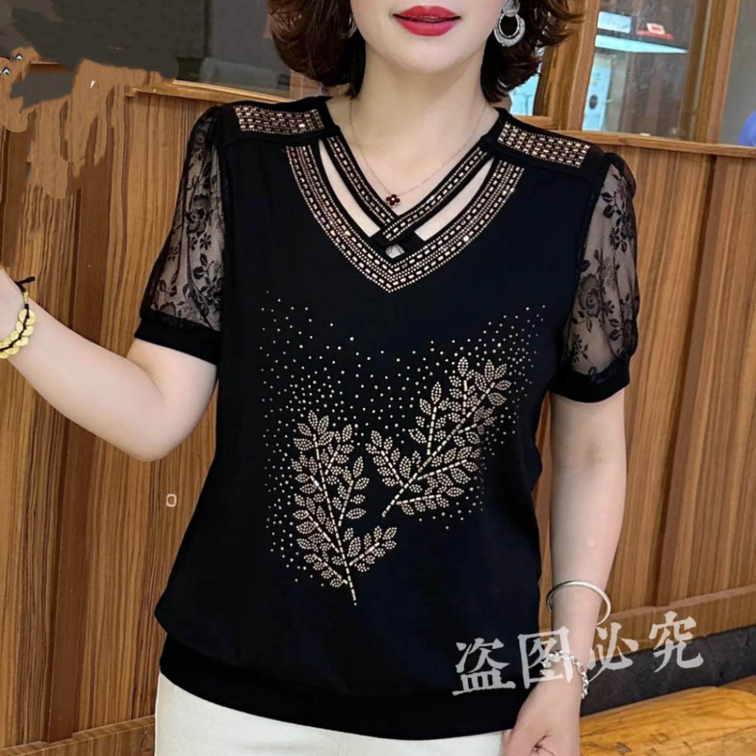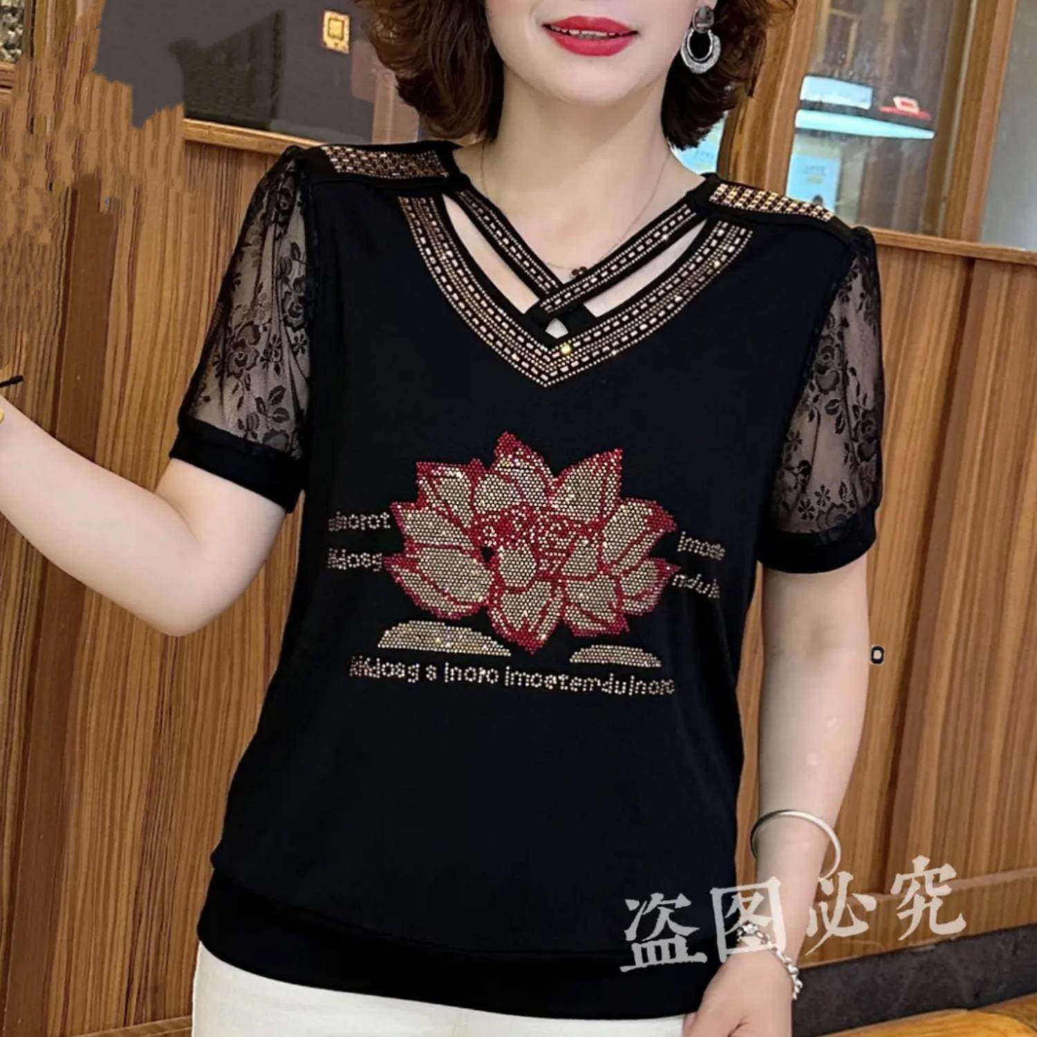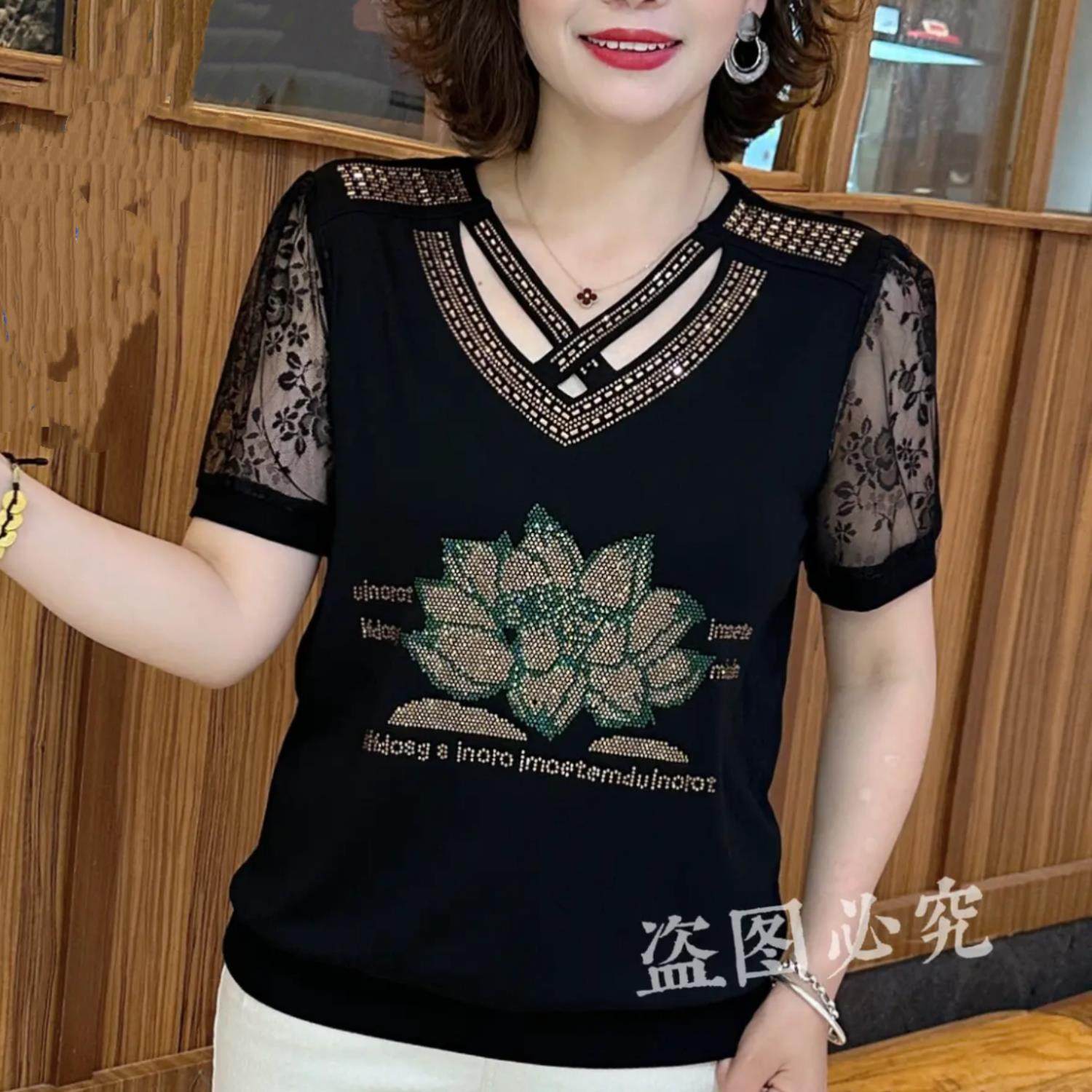 韩版 妈妈装 烫钻显瘦小衫 蕾丝袖 T恤 2025夏季 设计百搭洋气短袖 新款