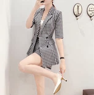 短裤 气质显瘦短袖 两件套装 时尚 外套 夏季 小个子复古格子职业小西装