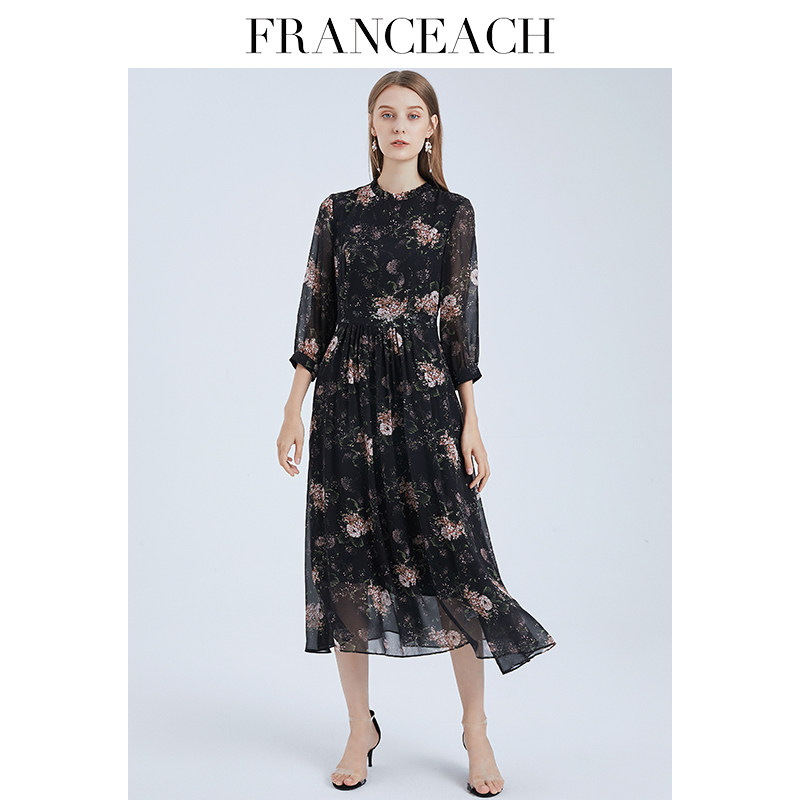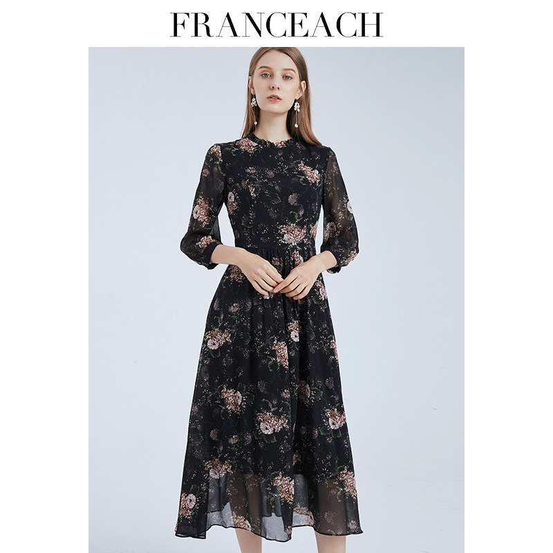 法涵意弛黑色7分袖 过膝到小腿120cm真丝长裙 桑蚕丝碎花连衣裙长款