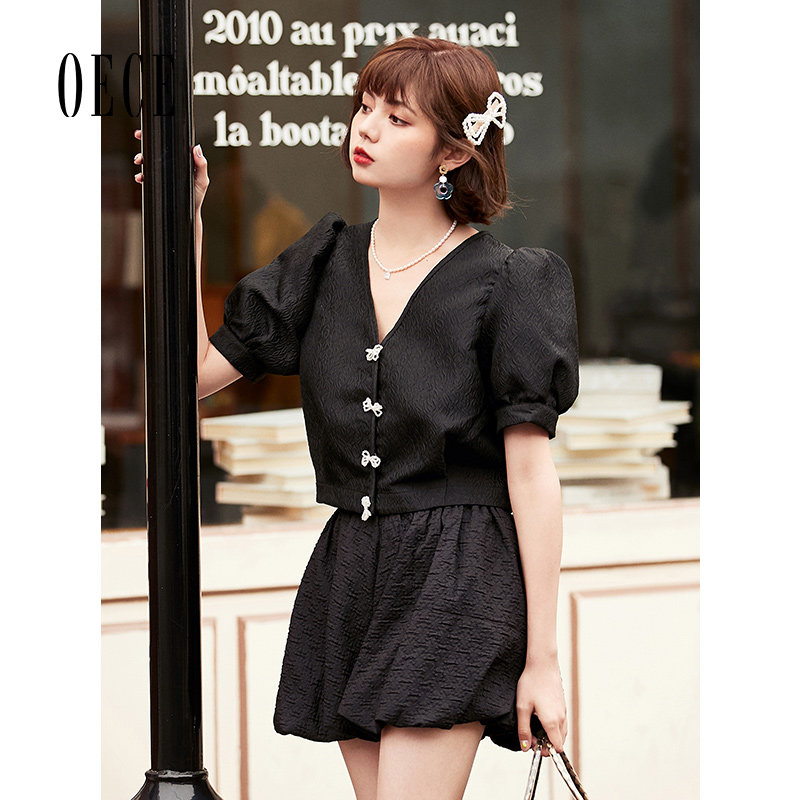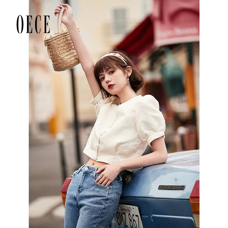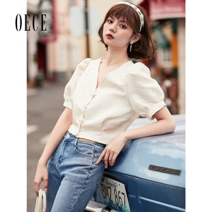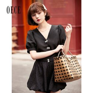 设计感短袖 Oece复古V领上衣夏装 通勤气质衬衫 女装 衬衣 新款