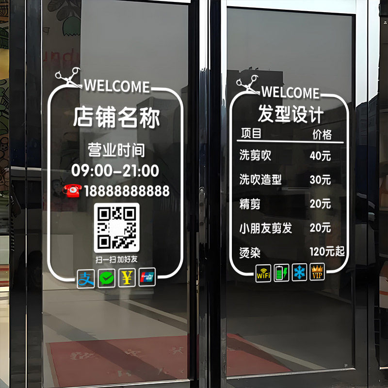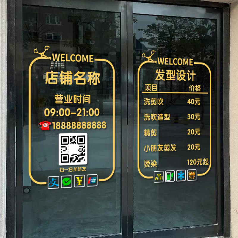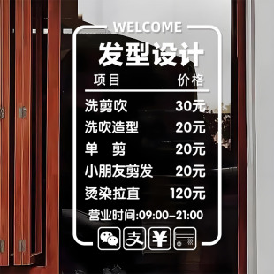 理发店价格表玻璃门贴纸创意美发店发廊橱窗装 饰可定制广告墙贴画