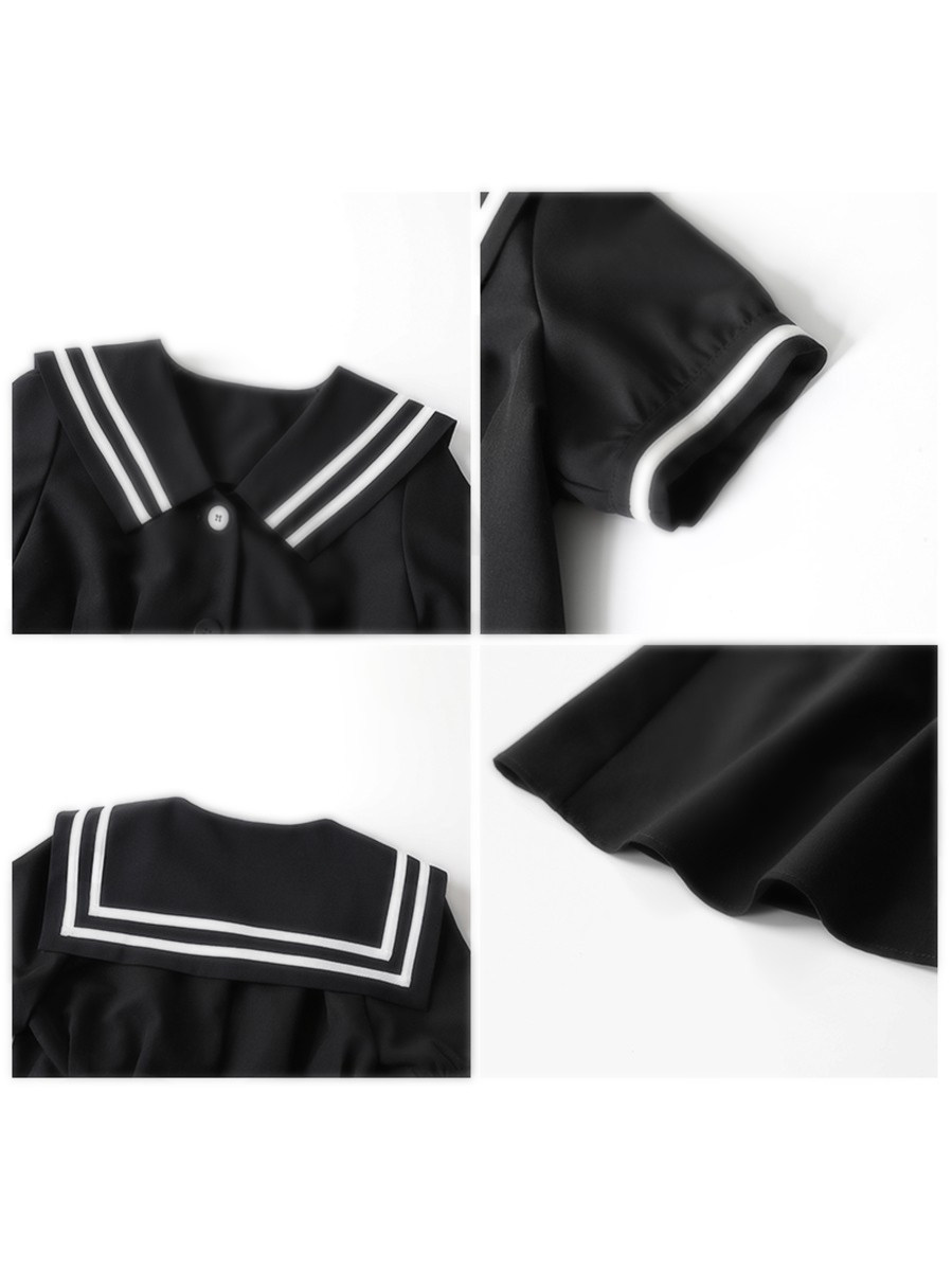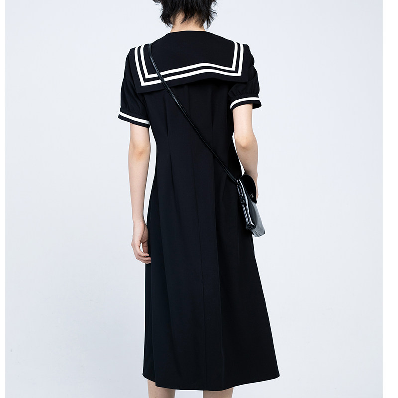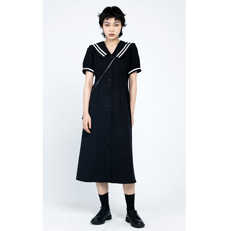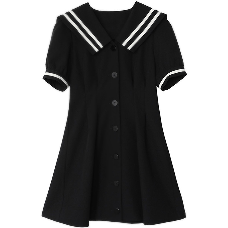 CHICVEN学院风v领海军领短袖 连衣裙a字气质黑色收腰裙子2022夏季