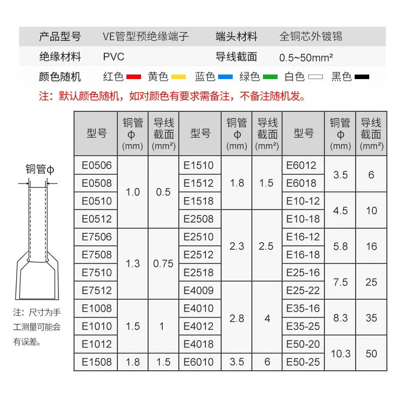 E2508针形压线接线端子 VE2508冷压端子 接2.5平方插针 管型 欧式