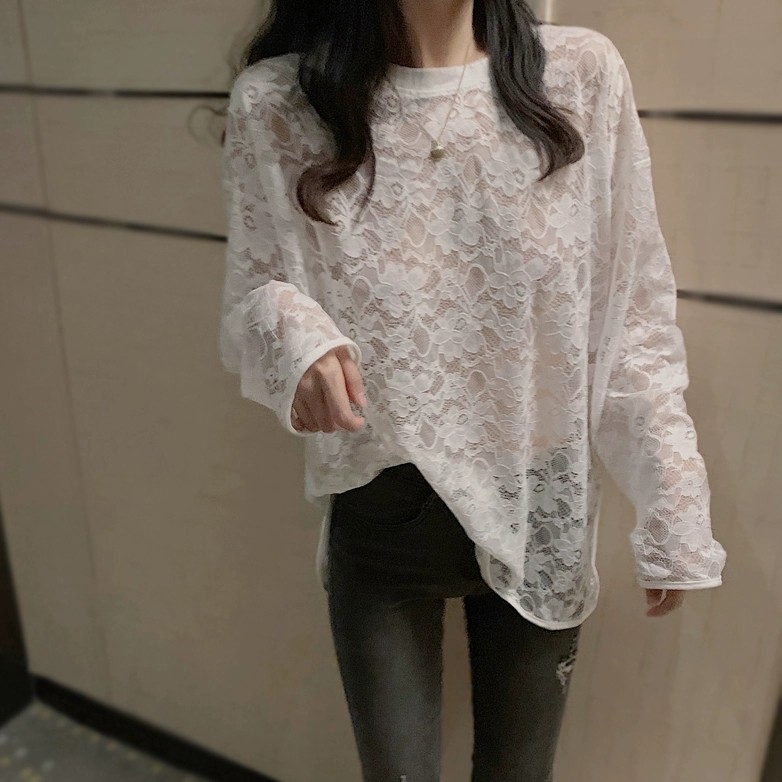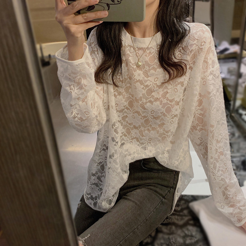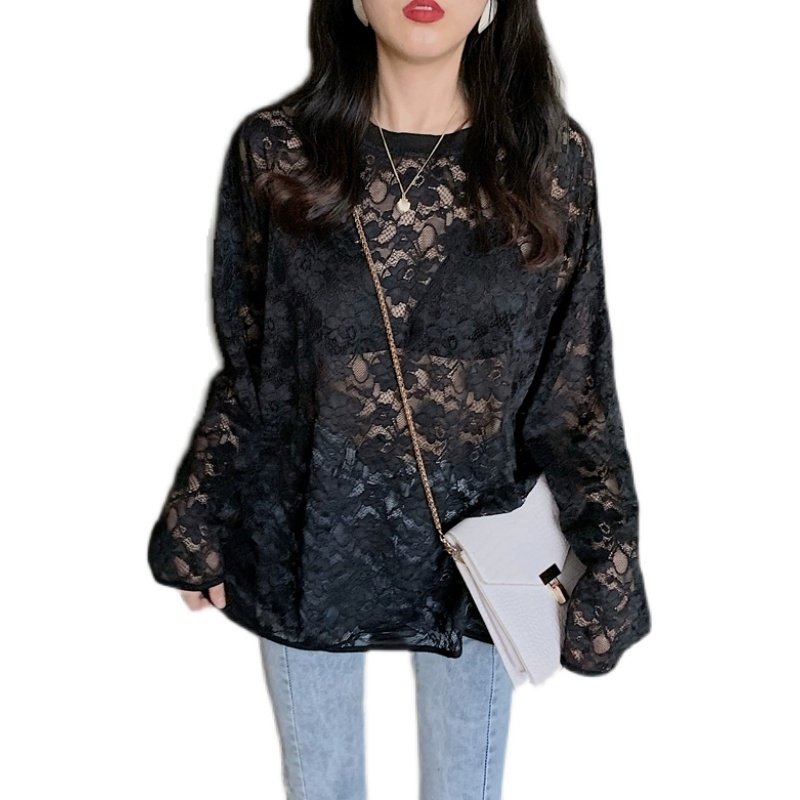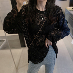 宽松显瘦镂空透视蕾丝打底衫 防晒罩衫 女长袖 网纱小衫 夏季 黑色新款