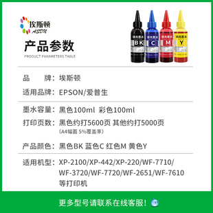 连供黑色彩色通用非原装 喷墨打印机3720墨水专用四色补充装 适用epson爱普生wf3720墨水 墨汁4色油墨 顺丰