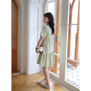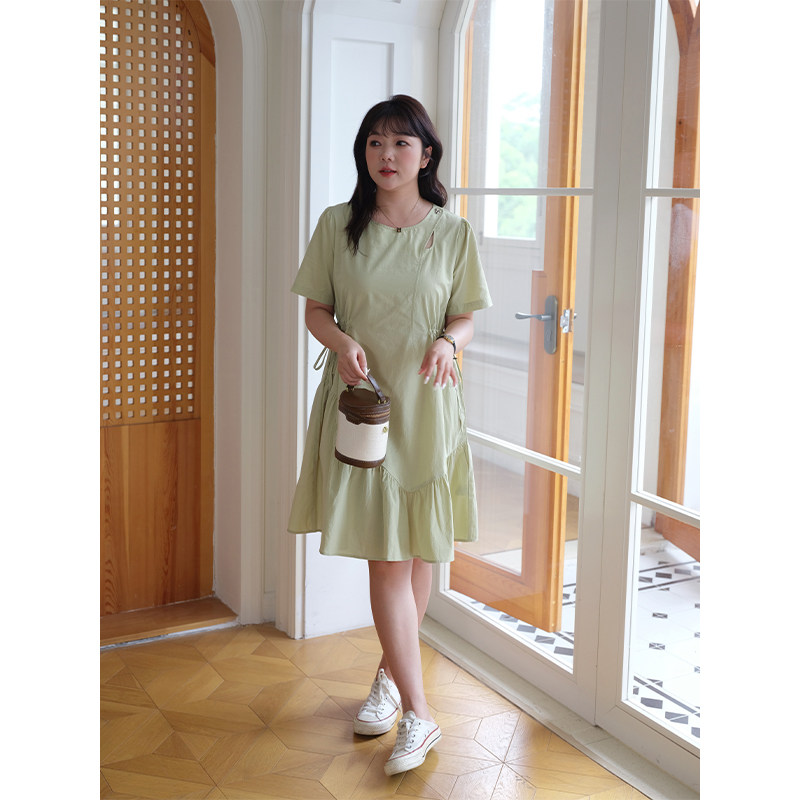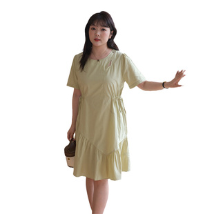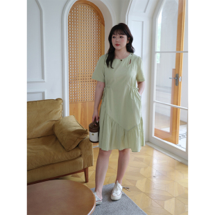 新品 设计感抽绳中裙胖mm夏装 减龄小清新收腰连衣裙 女装 蓝若水大码