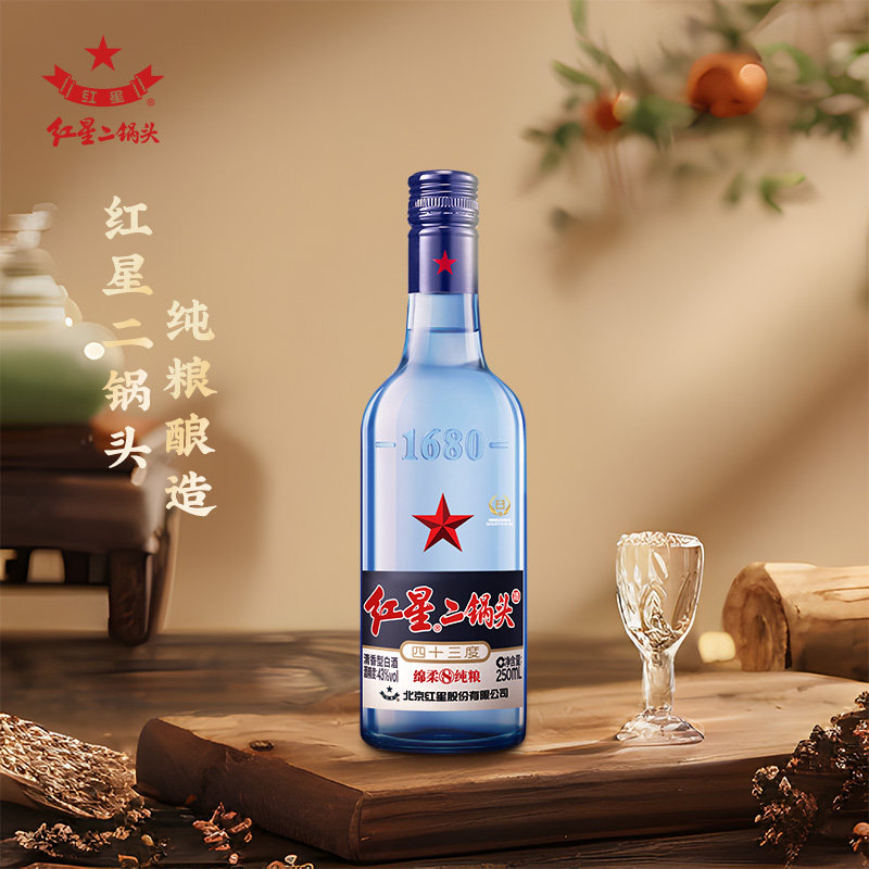 小蓝瓶43度250ml 北京红星二锅头纯粮高度口粮酒 6瓶清香型白酒