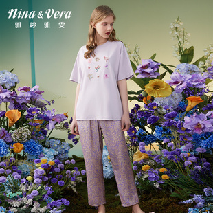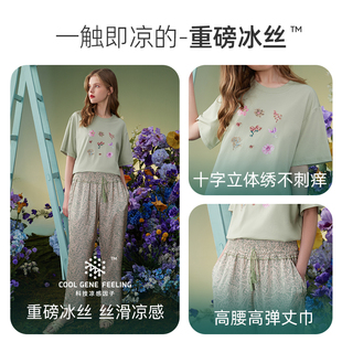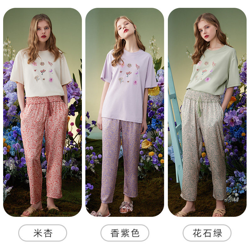 睡衣女夏季 新款 短袖 冰丝长裤 雅婷雅雯 可外穿家居服套装 十字绣