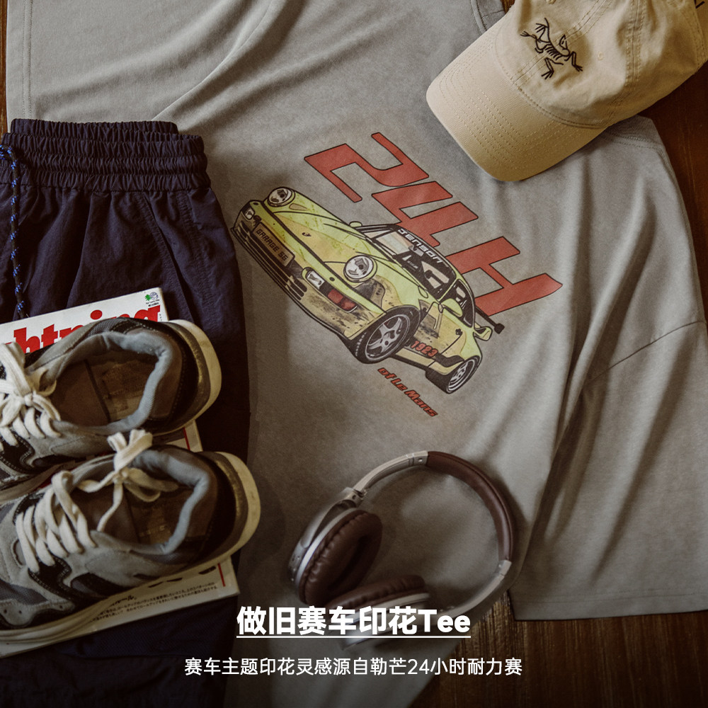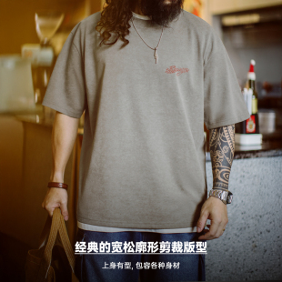 男夏 复古机车后背印花T恤水洗做旧灰绿宽松廓形短袖 马登工装 美式