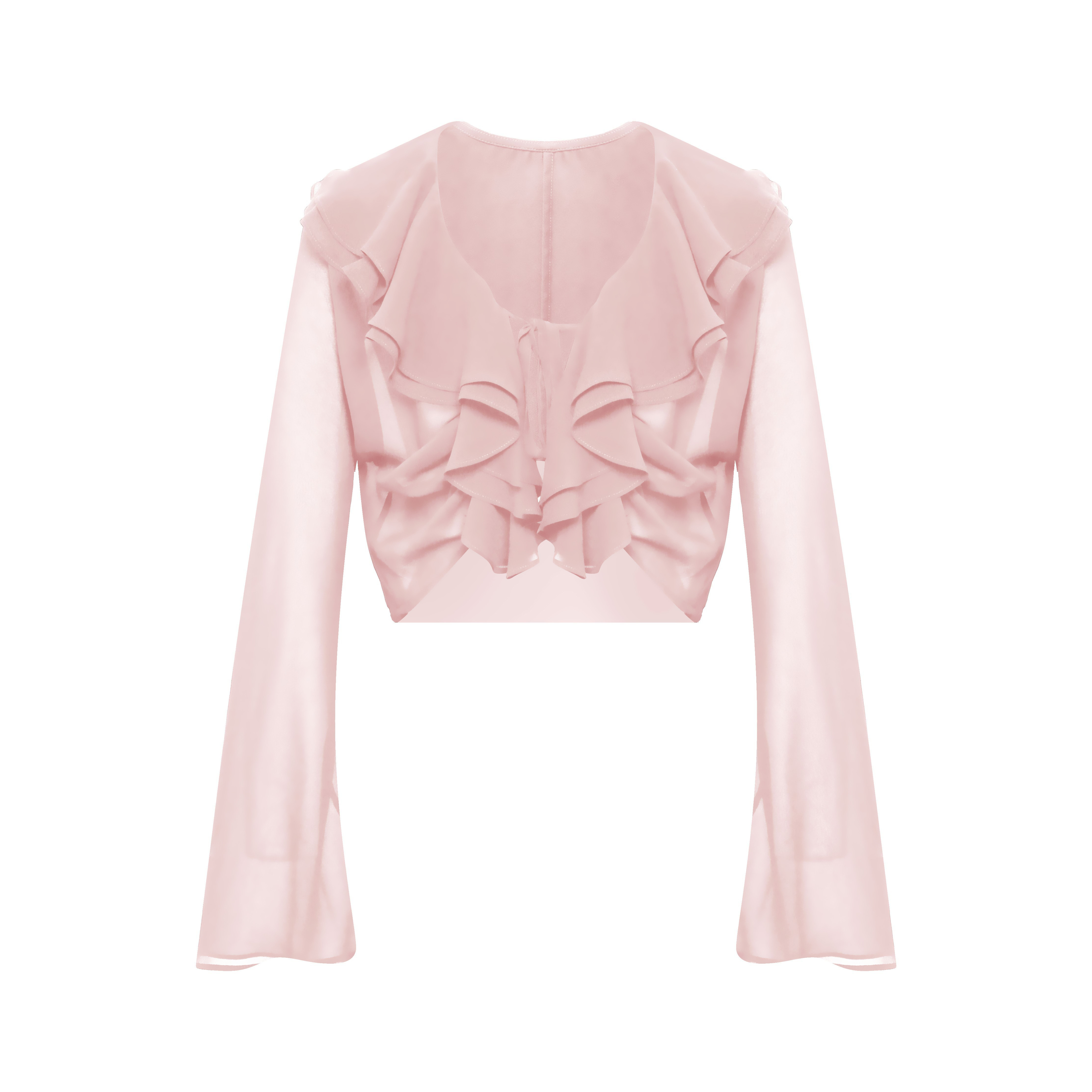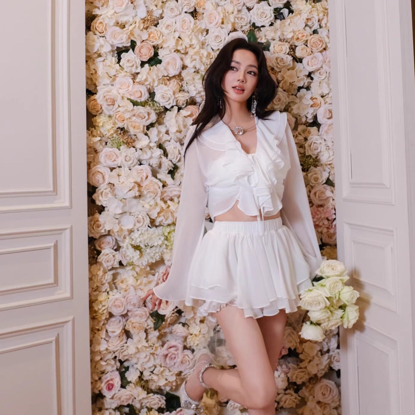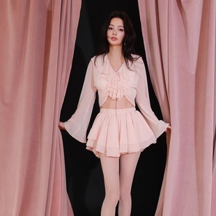 网纱木耳边衣襟微喇袖 MaisonWester新款 外搭层次花苞短裤 折`