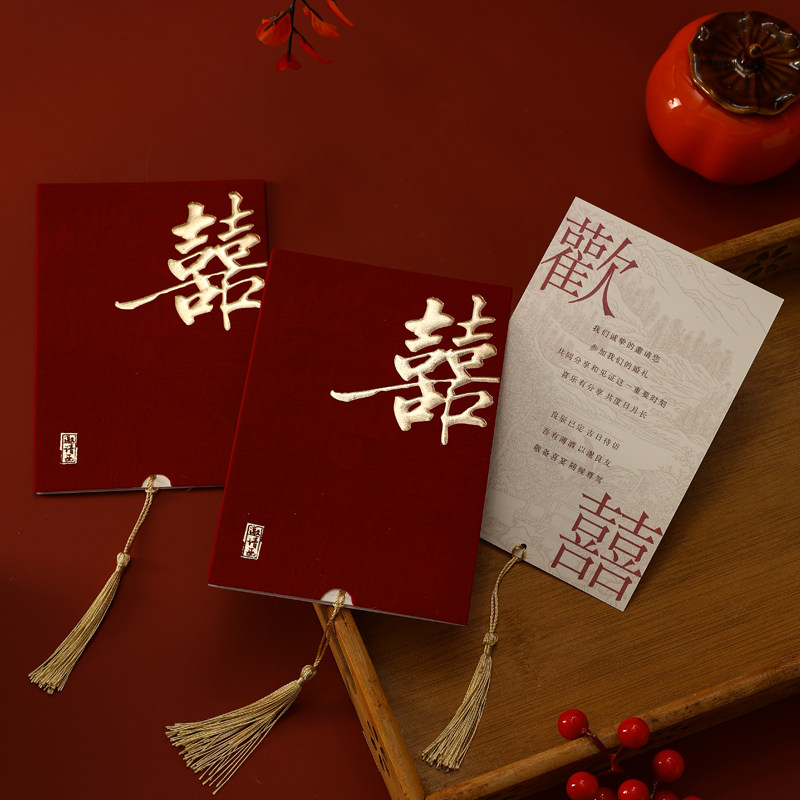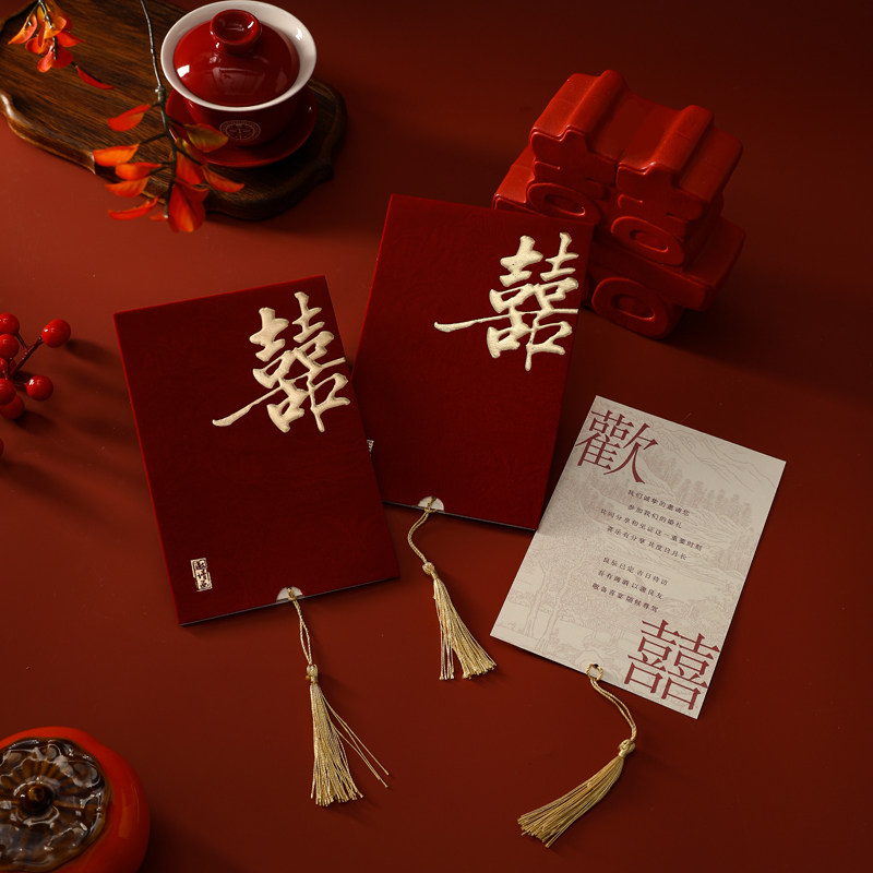请帖结婚邀请函酒红丝绒布流苏中式 答谢宴原创中国风喜帖婚礼请柬