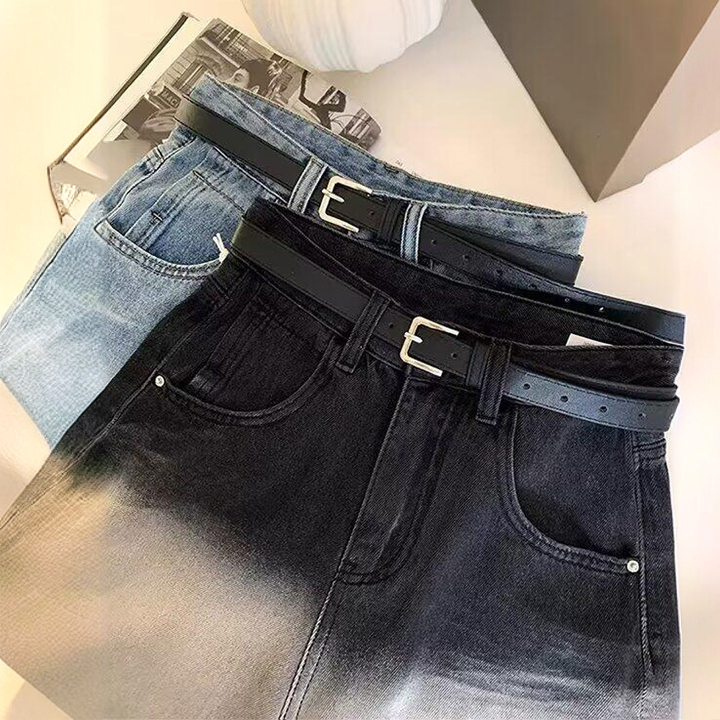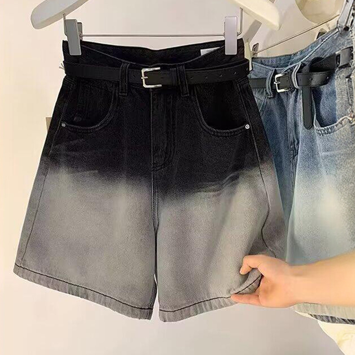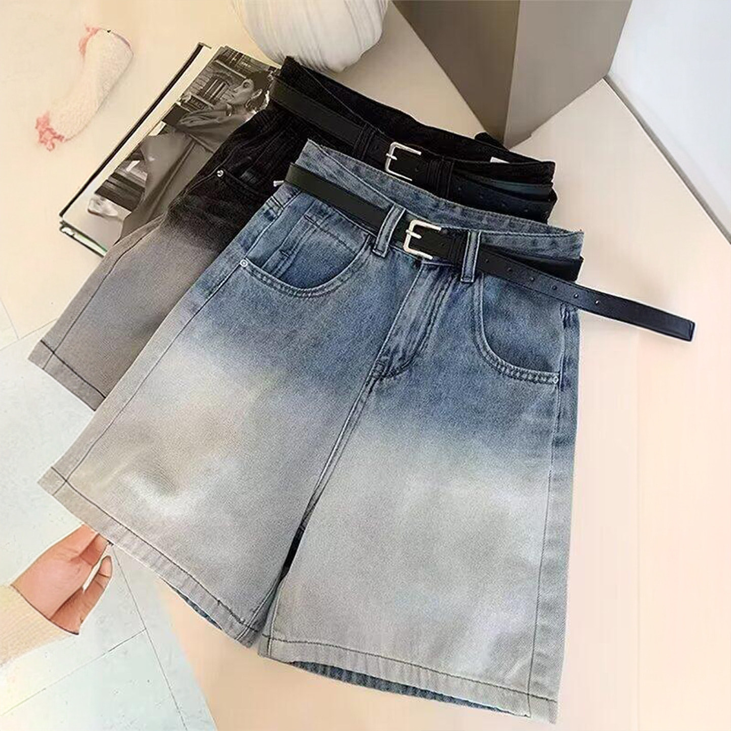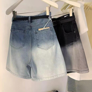 女高腰显瘦宽松直筒五分裤 复古渐变色牛仔短裤 胖mm美式 300斤大码