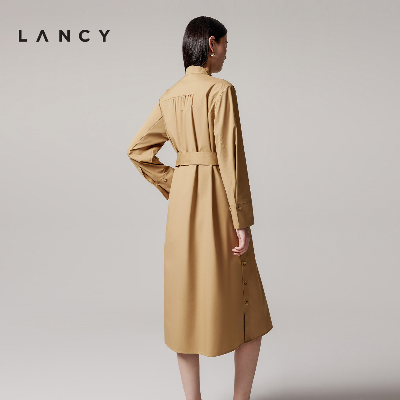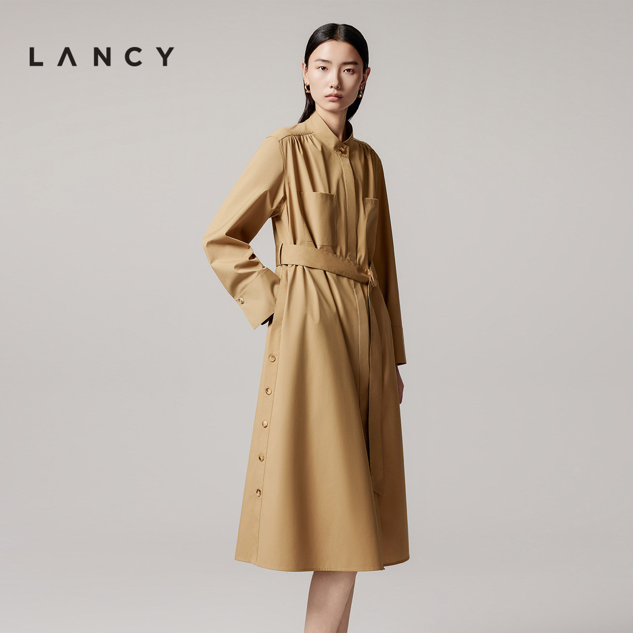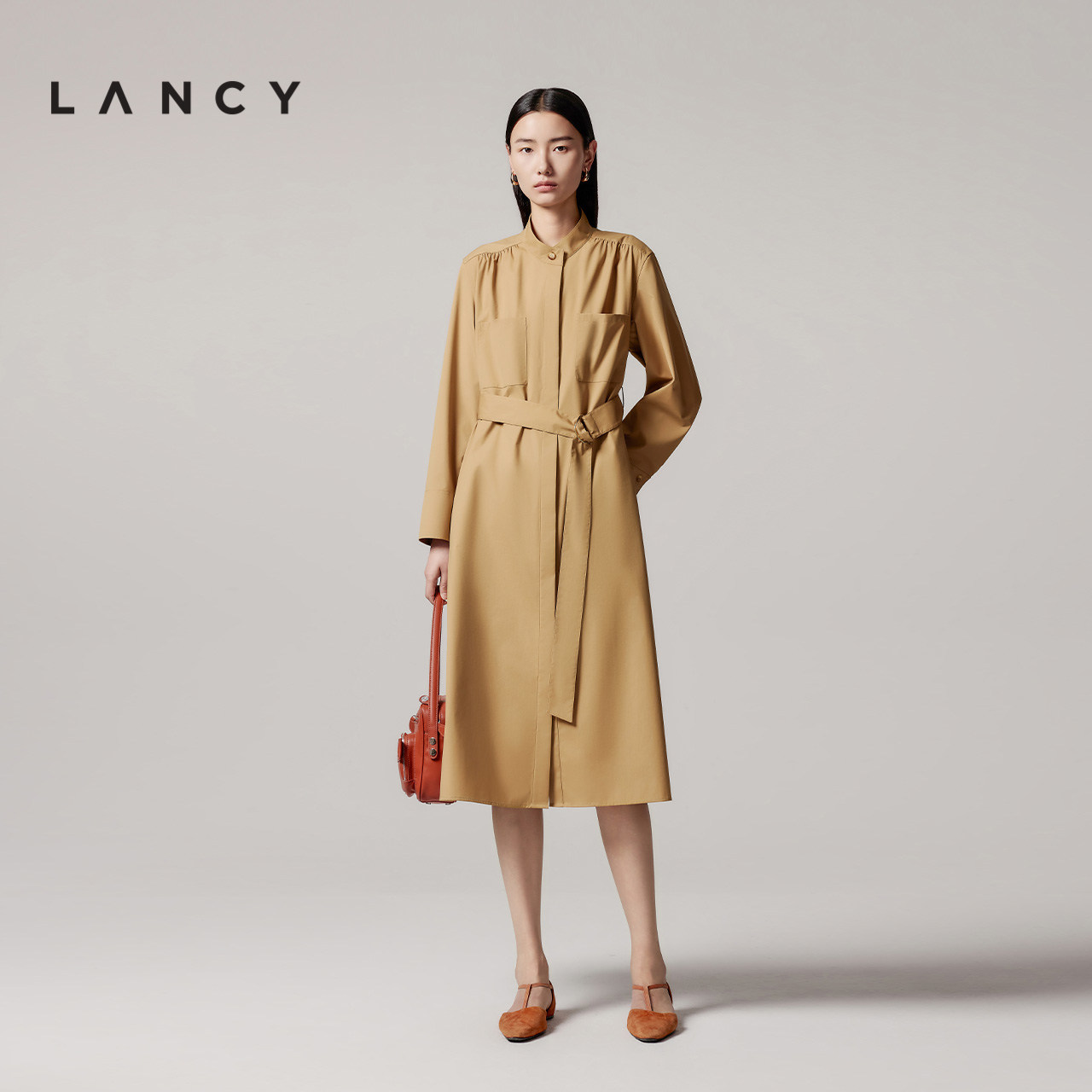 朗姿2025秋季 收腰长款 新款 立领长袖 显瘦风衣连衣裙子女 日式 LANCY