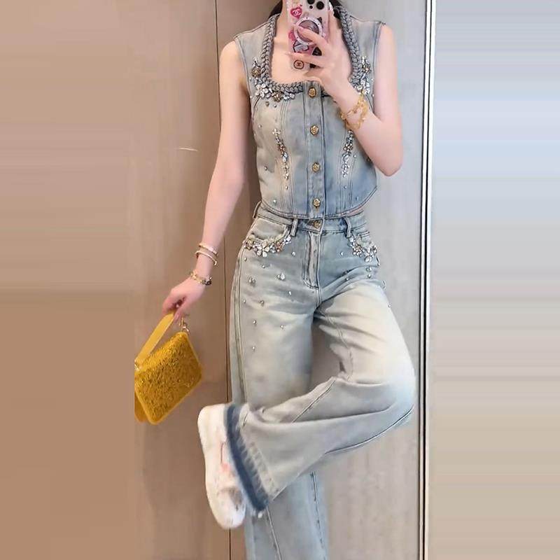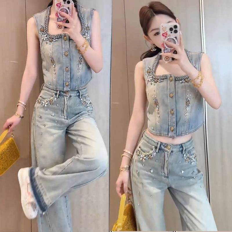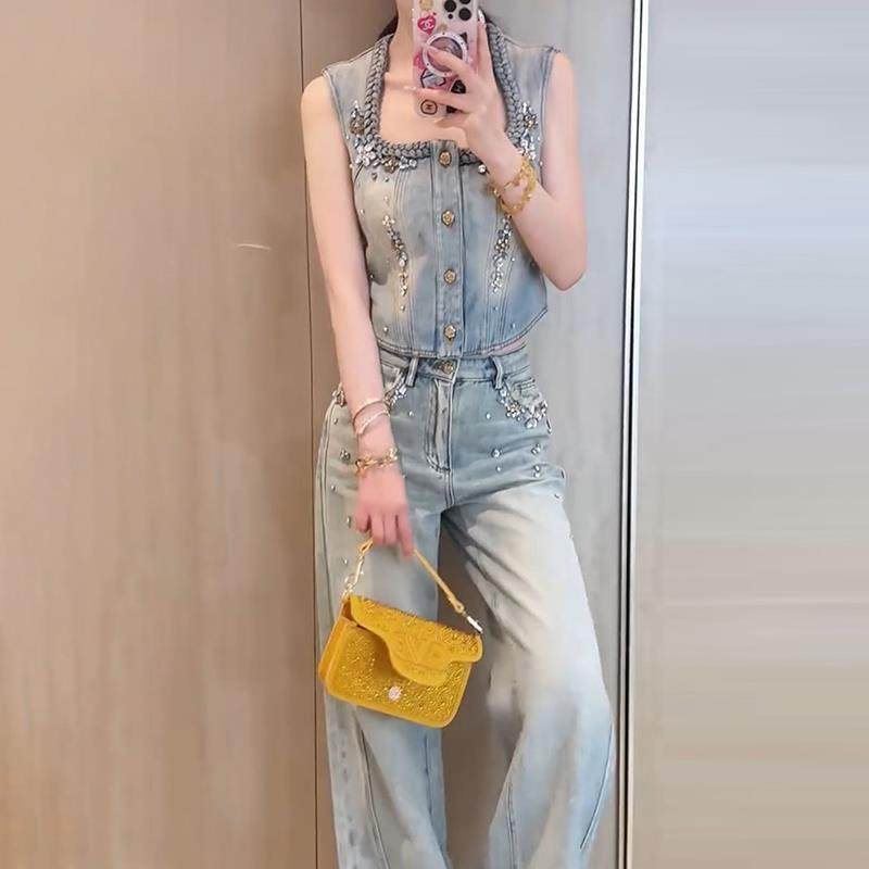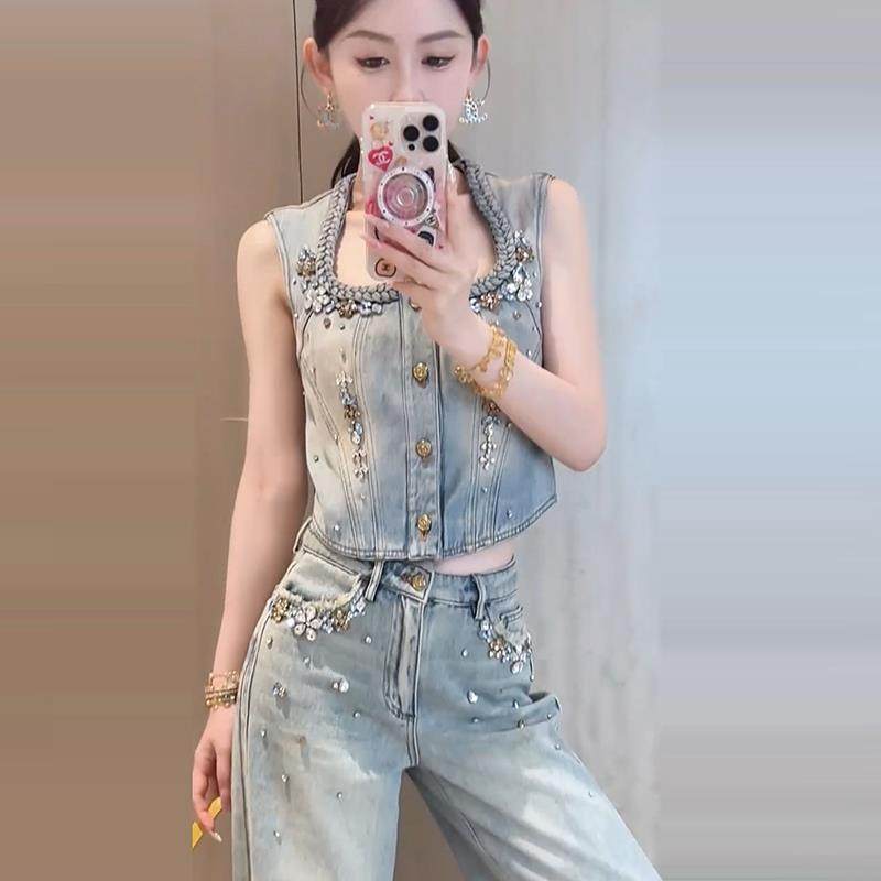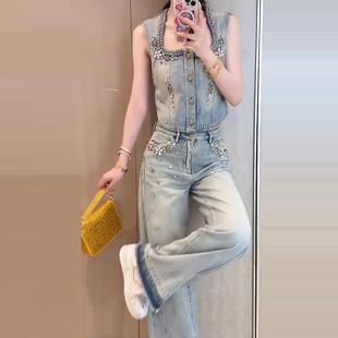 重工镶钻显瘦马夹阔腿裤 个性 女夏2025新款 牛仔套装 两件套 潮流无袖