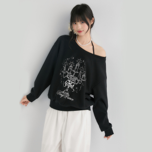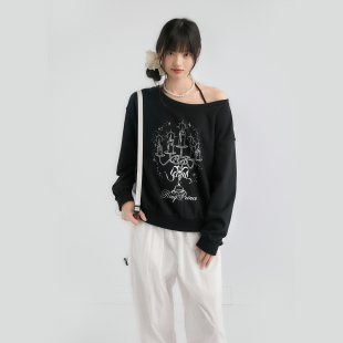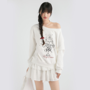 King Prince手绘烛台印花斜肩上衣宽松套头一字肩圆领露肩卫衣女