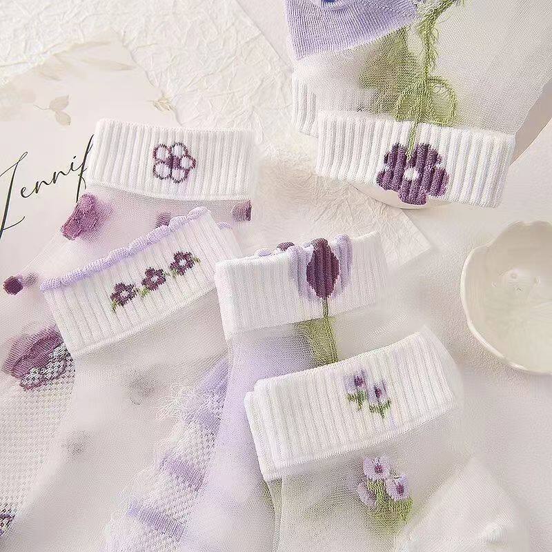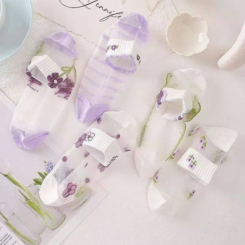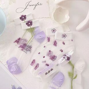 玻璃丝水晶袜子女士ins潮夏季 甜美透明短袜花朵丝袜超薄船袜 薄款