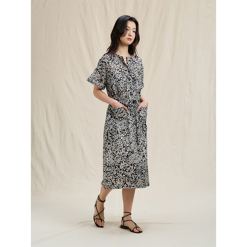 韩国chic秋季 小个子连衣裙女 复古洋气圆领麻花纹宽松直筒泡泡袖