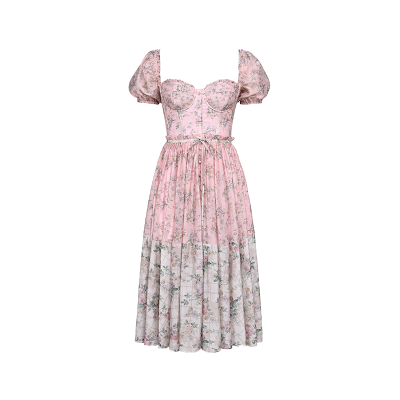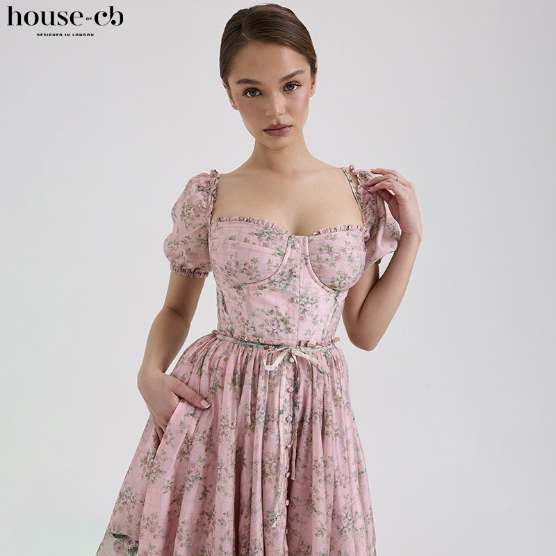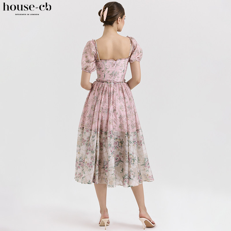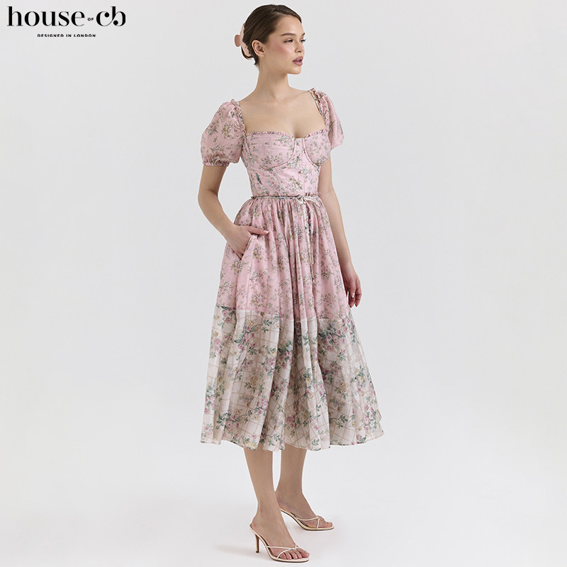 House CB波西米亚风复古粉色花卉雪纺中长连衣裙Penelope