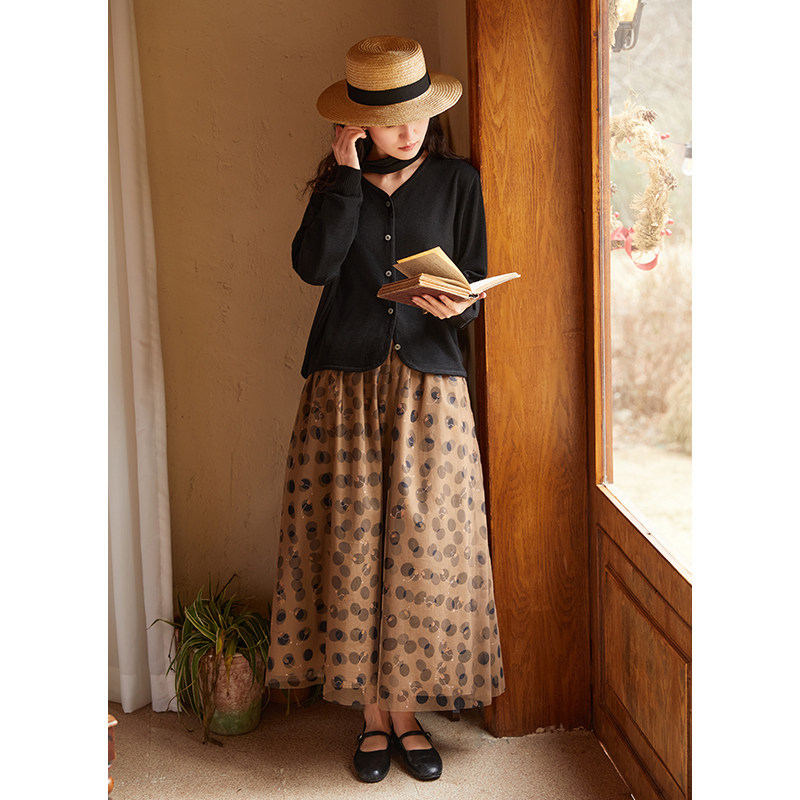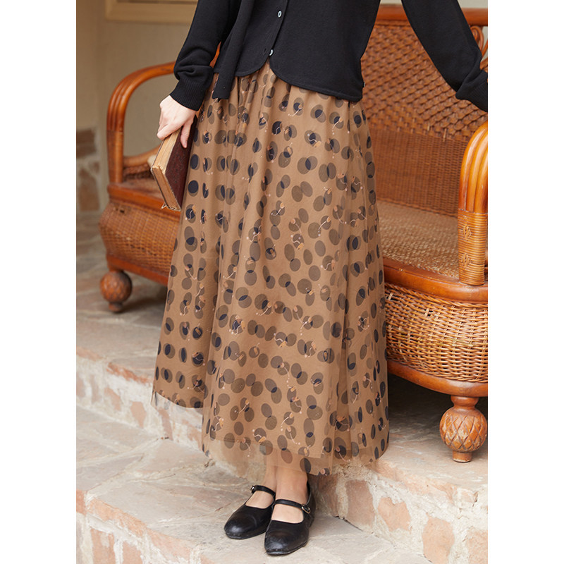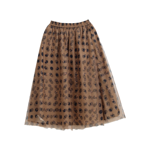 100%优质棉浅咖底黑波点网纱a字半身裙 春季 忘城H1117座 繁星闪烁
