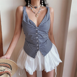chenopod自制2026春夏澳洲小众深V格子收腰显瘦无袖 度假上衣背心
