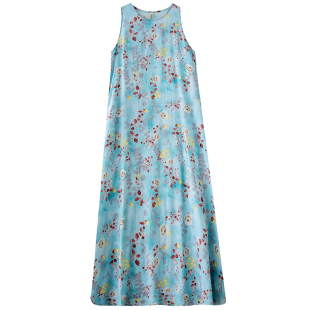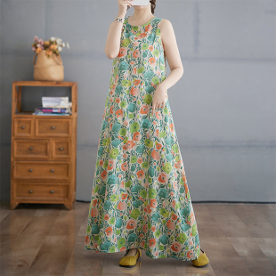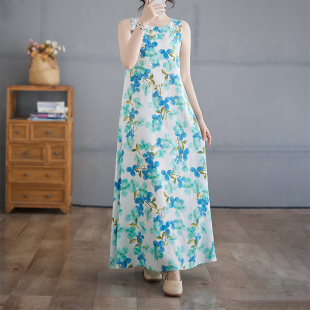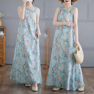 棉麻背心连衣裙 轻薄过膝好穿好看 过膝碎花长裙子印花度假高腰
